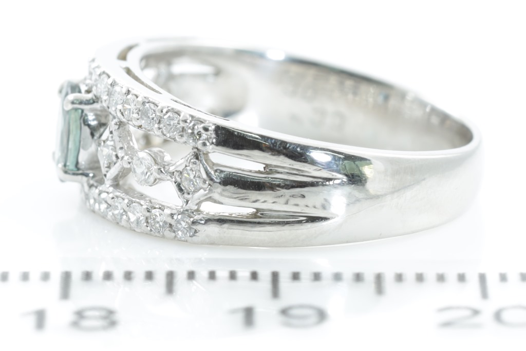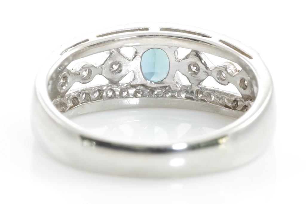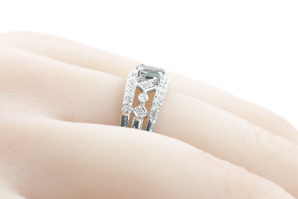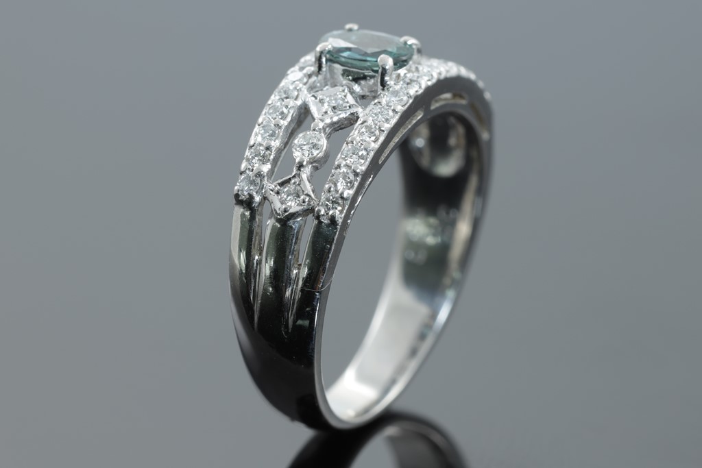 Alexandrite and Diamond ring with oval Alexandrite of 0.30ct (colour change from green to purple) and round Diamonds totalling 0.33cts (Estimated grading: H-I SI). Platinum. Ring size: L - ring resizing is not recommended. Weight: 6.5g. (Pre-owned)