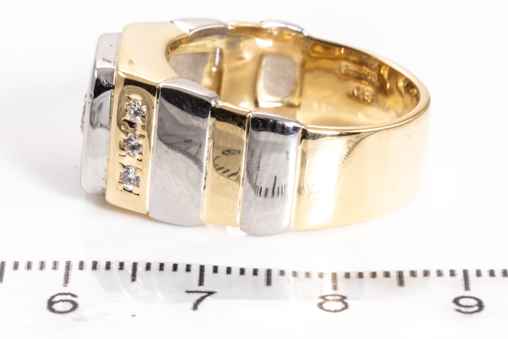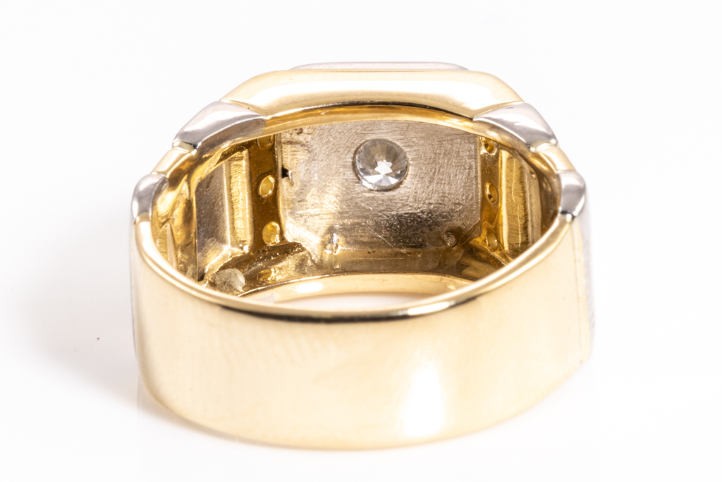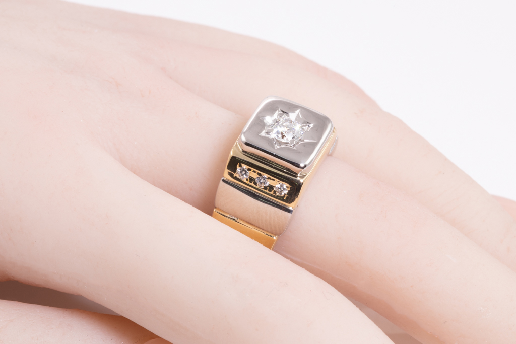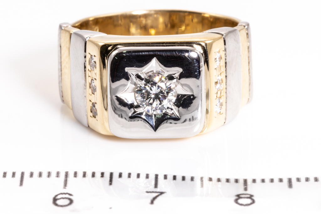 Diamond mens ring with centre round Diamonds of 0.30ct (Estimated grading: G VS) and 6 shoulder round cut Diamonds totalling 0.12cts. 18ct yellow gold and platinum. Ring size U - ring resizing is not recommended. Weight: 18.2g. (Pre-owned)