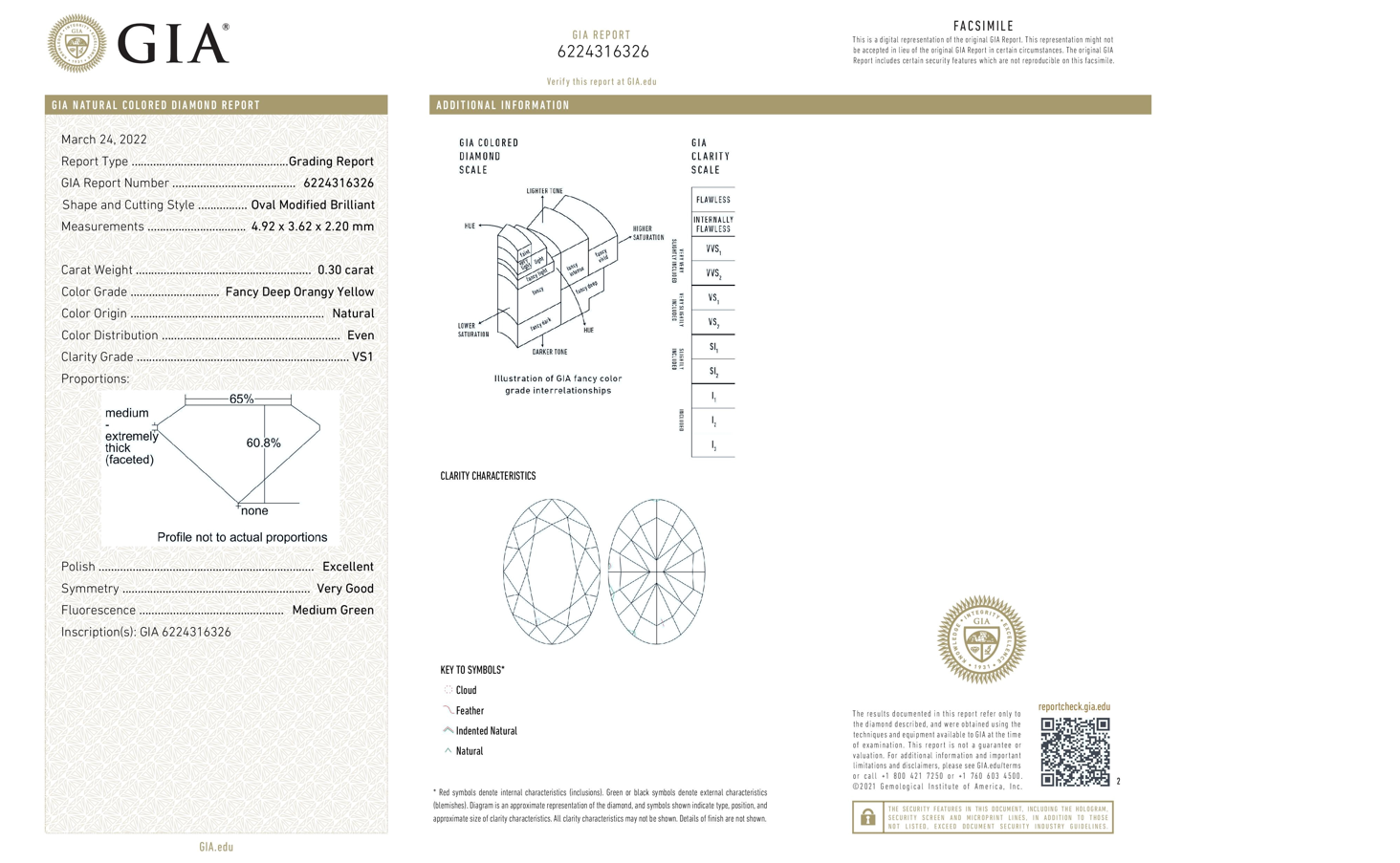 A loose oval shape Diamond of 0.30ct (with GIA report graded as Natural Fancy Deep Orangy Yellow Even VS1#6224316326). (New)