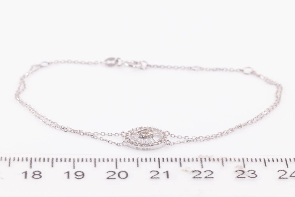 Diamond bracelet with round and baguette cut Diamonds totalling 0.30cts (Estimated grading: H P1-P2, L SI). 18ct white gold. Length: 17.5cm. Weight: 1.6g. (Pre-owned)
