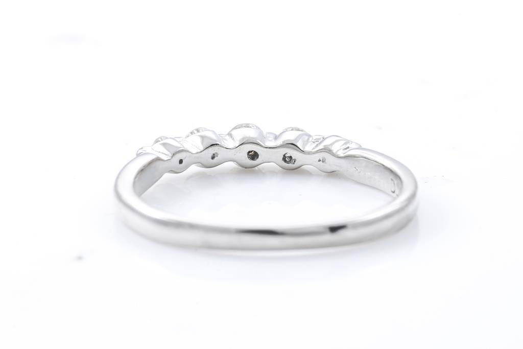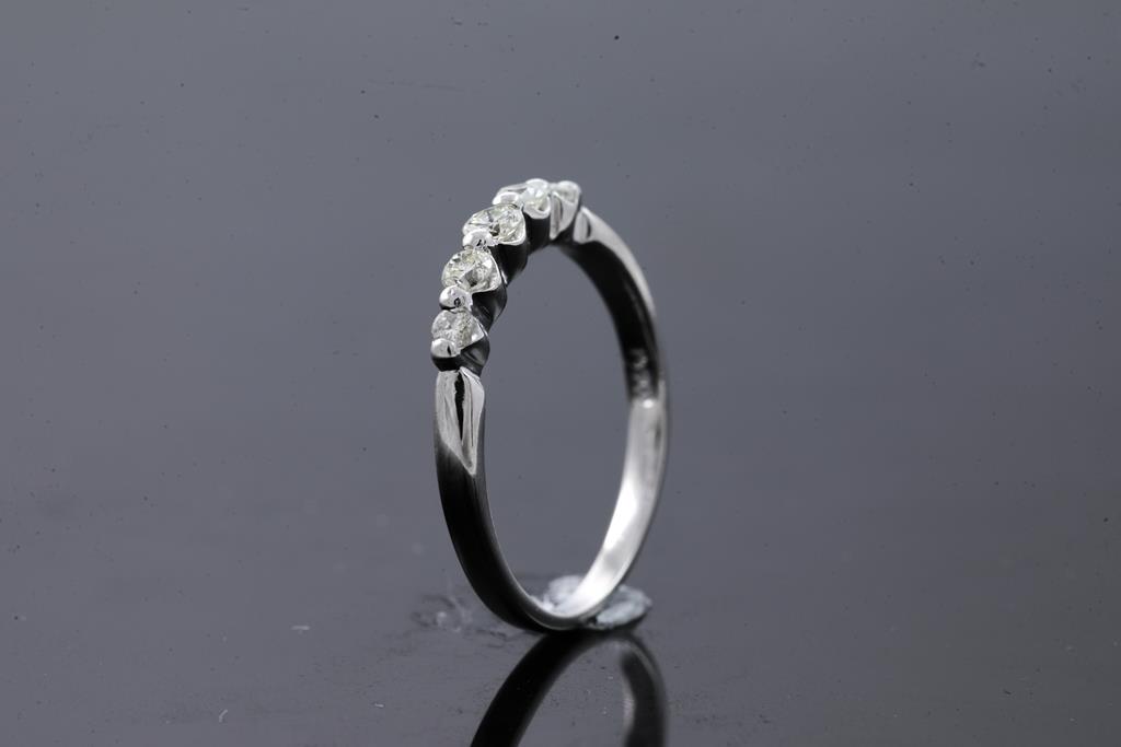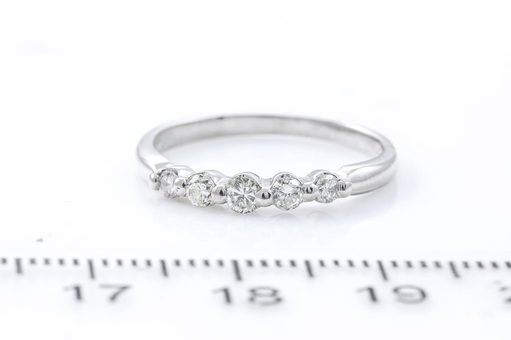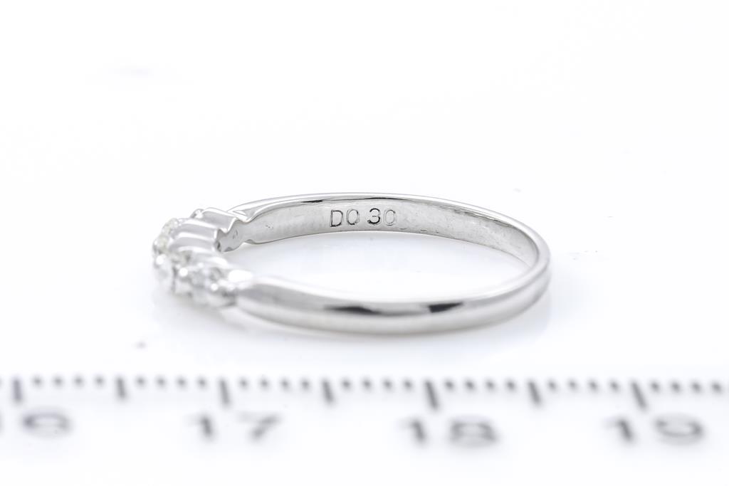 Diamond Eternity ring with 5 round Diamond totalling 0.30cts (Estimated grading: I-K SI-P1). Platinum. Ring size L - ring resizing is not recommended. Weight: 3g. (Pre-owned)