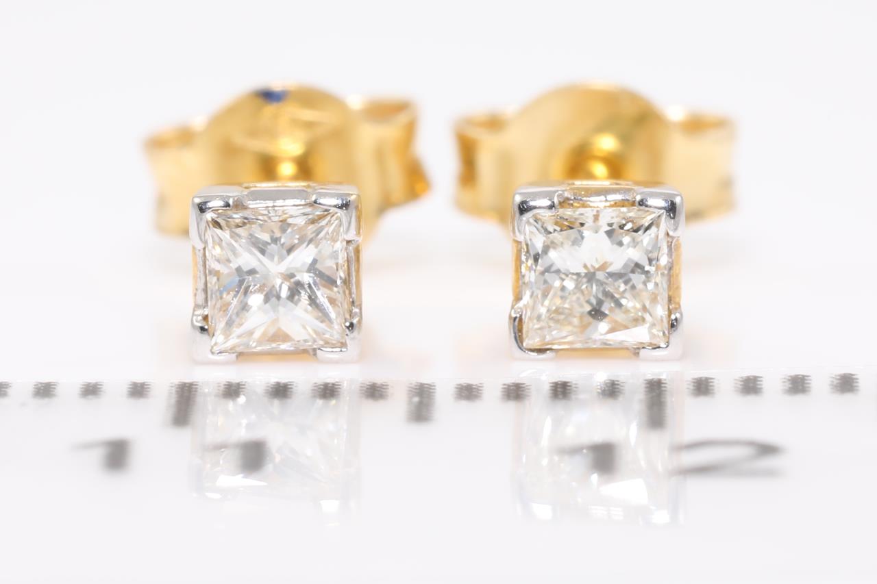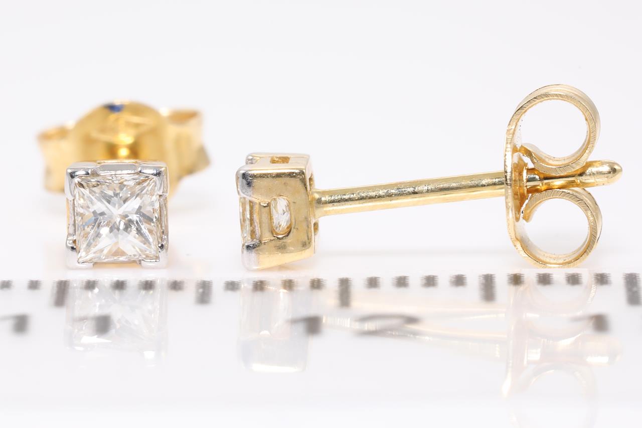 Diamond stud earrings with princess cut Diamonds totalling 0.30cts (Estimated grading: G-H VS-SI). 18ct yellow gold. Weight: 1.2g. (As New)