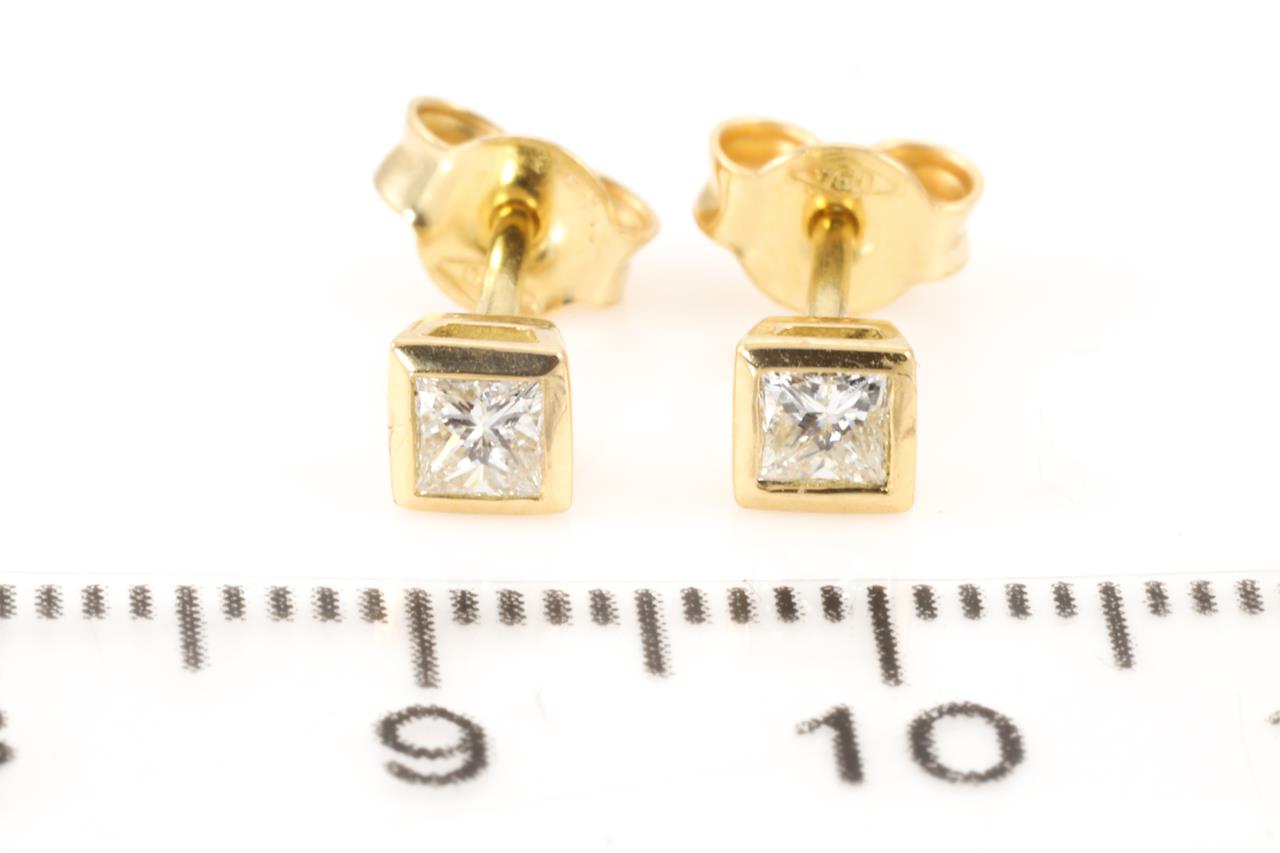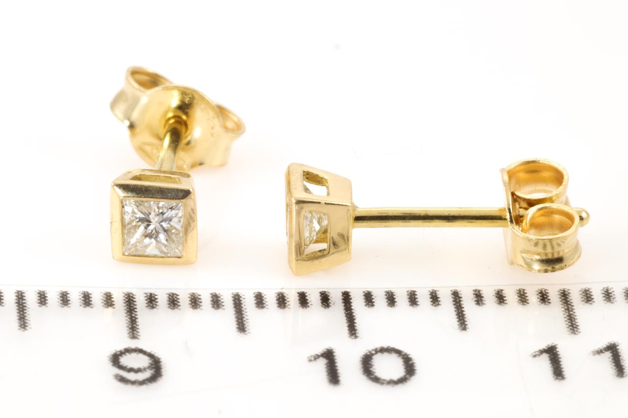 Diamond stud earrings with princess cut Diamonds totalling 0.30cts (Estimated grading: G-H VS-SI). 18ct yellow gold. Weight: 1.2g. (As New)