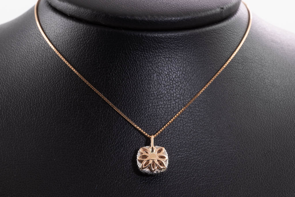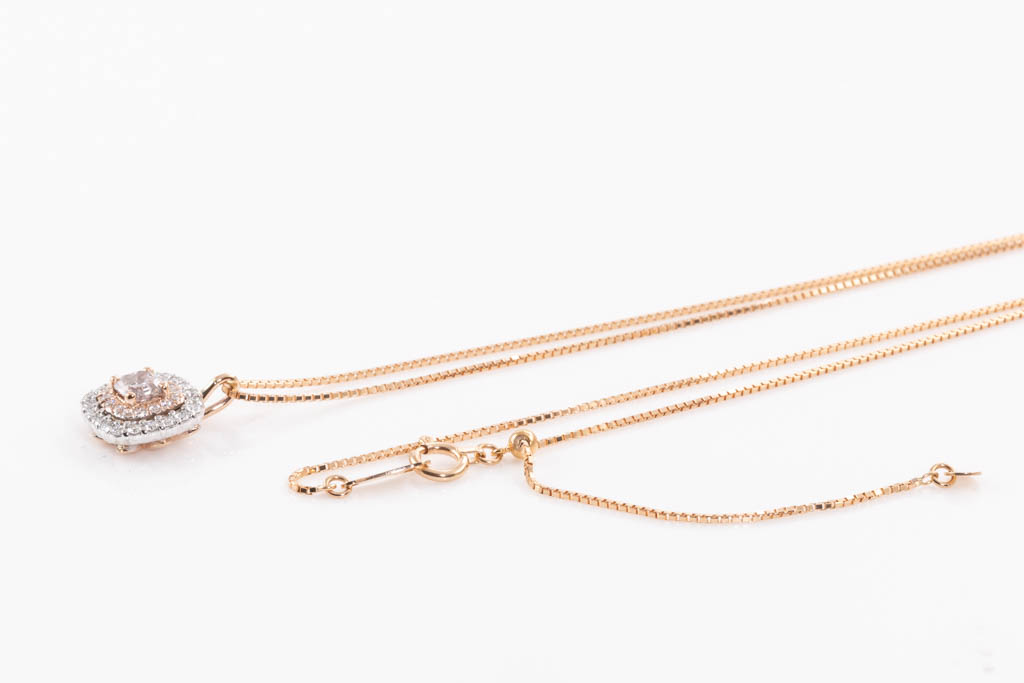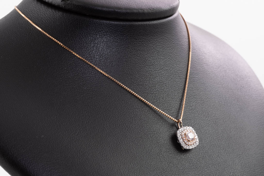 Diamond double halo pendant with centre radiant cut Diamond of 0.30cts (with GIA report graded as Natural Fancy Brownish Pink Even #2205719909, FSA estimated clarity grade: P1-P2) surrounded by round Diamonds totalling 0.20cts (Estimated grading: F-G VS). 18ct rose & white gold with 44cm 18ct rose gold adjustable chain. Weight: 4.0g. (New)