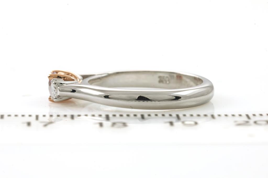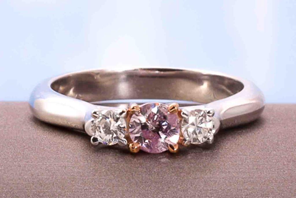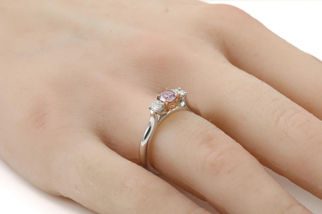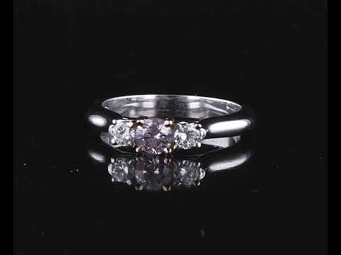 Diamond trilogy ring with centre round brilliant cut Diamond of 0.30ct (with GIA report graded as Natural Fancy Pink-Purple Even #2185590294, FSA estimated clarity grade: P2-P3) and 2 shoulder round Diamonds totalling 0.29cts. Ring size L. Weight 5.1g. (New)