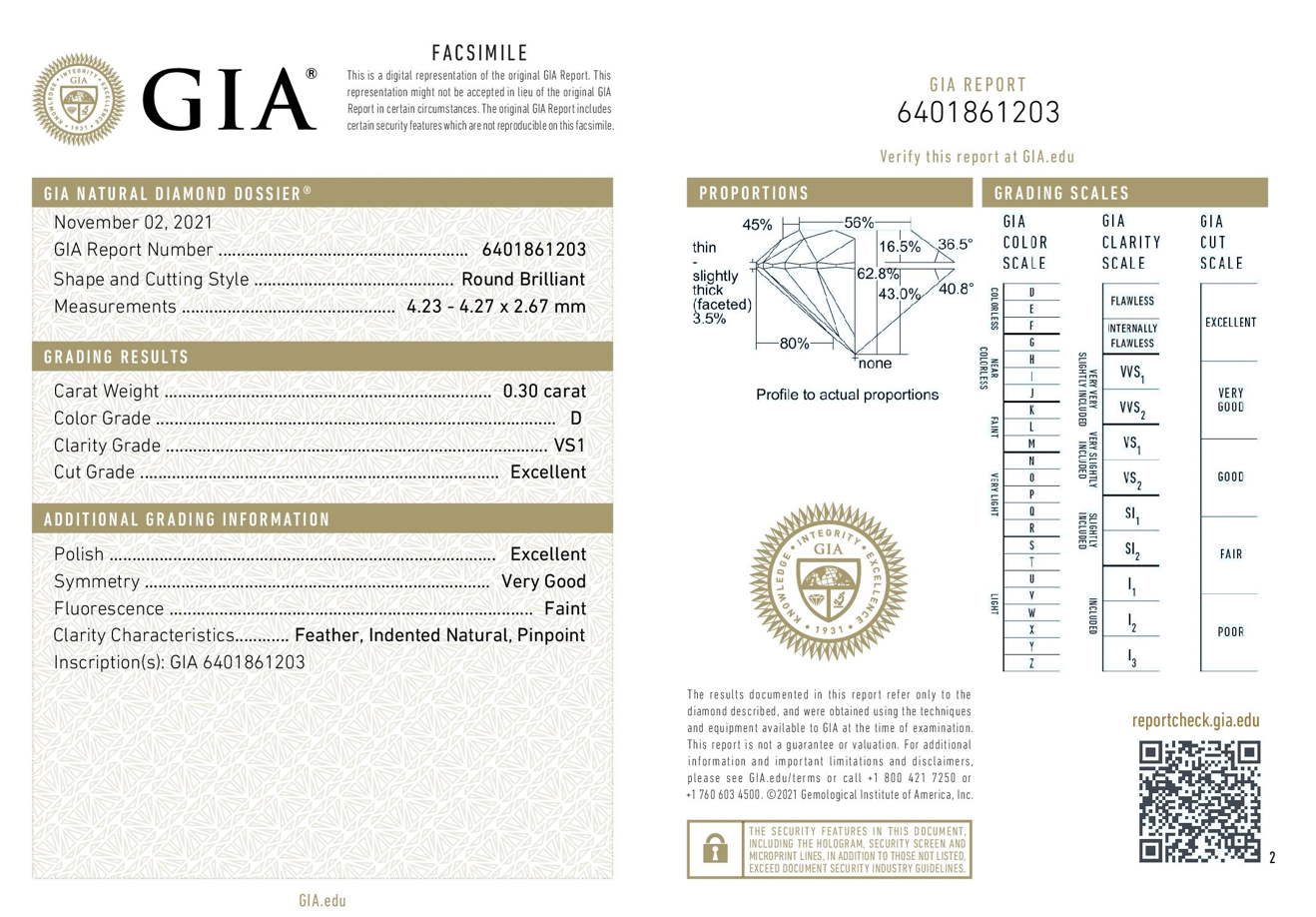 A loose round brilliant cut Diamond of 0.30ct (With GIA summary report graded as D VS1#6401861203