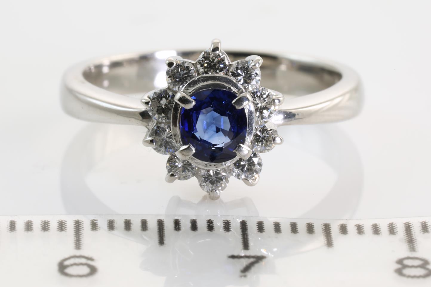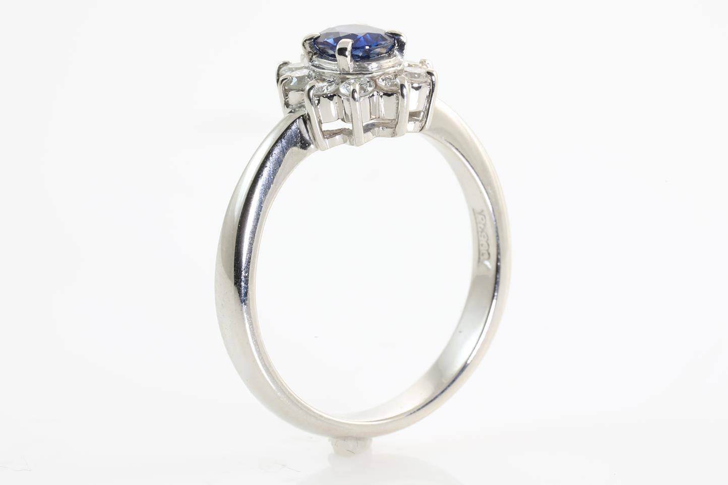 Sapphire and Diamond ring with round shape Sapphire of 0.30ct and Diamonds totalling 0.41cts (Estimated grading: H SI). Platinum. Ring size: L - Ring resizing is not recommended. Weight: 5.3g (Pre-owned)