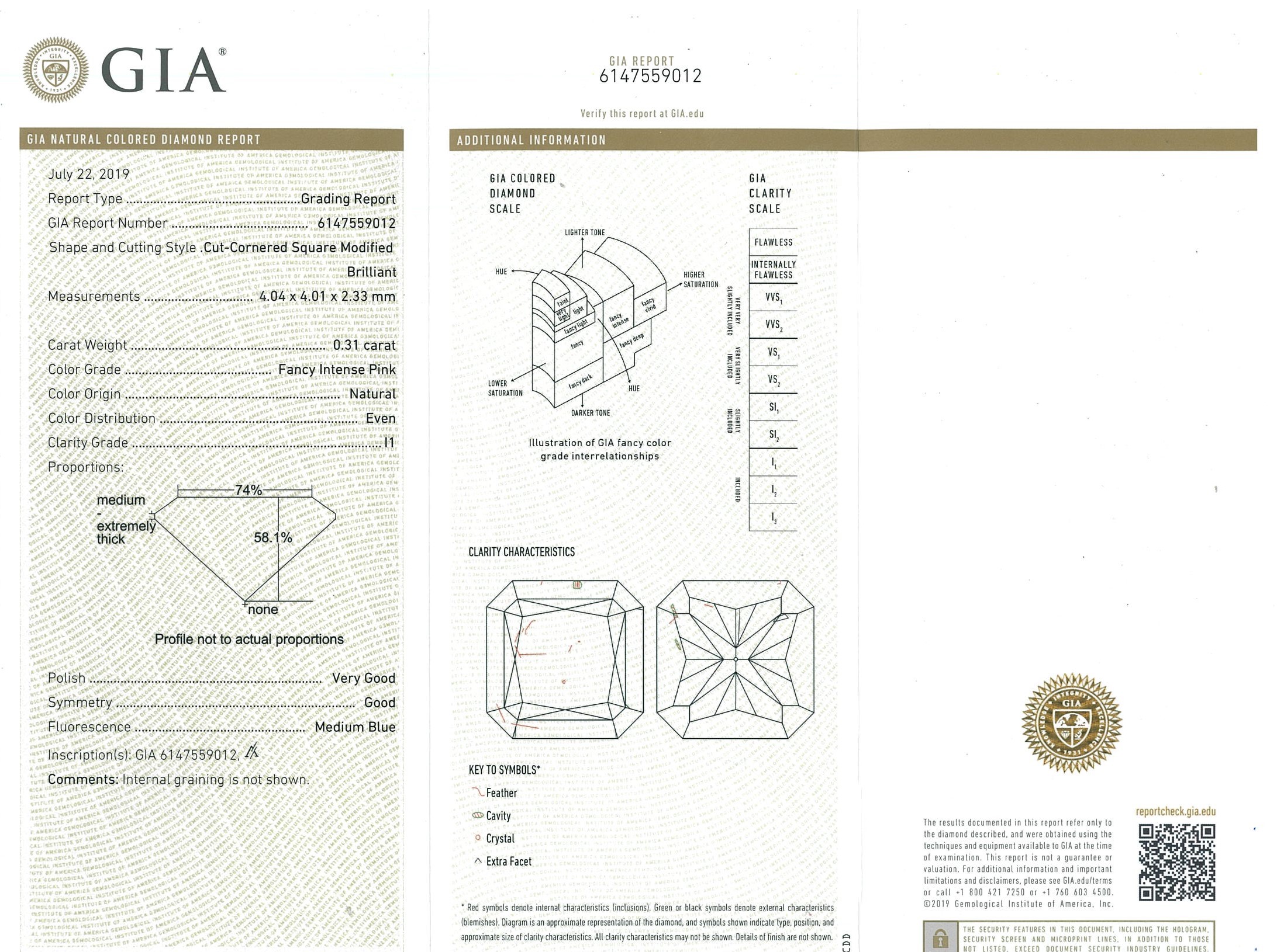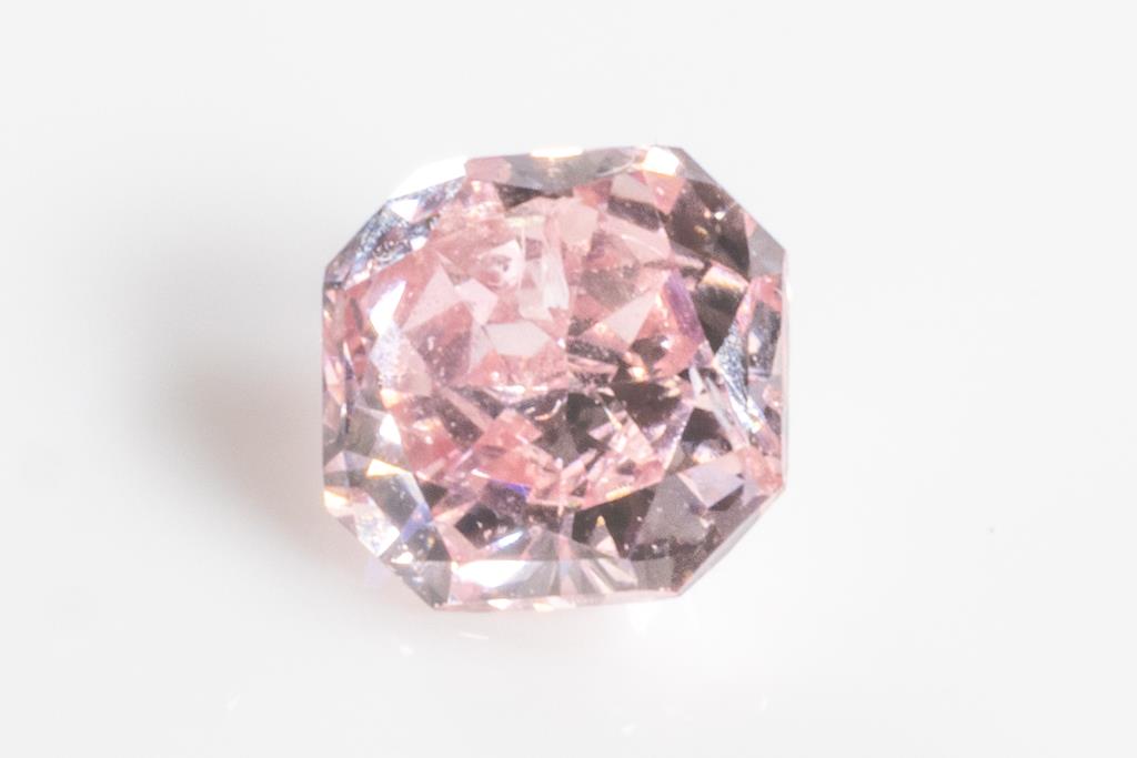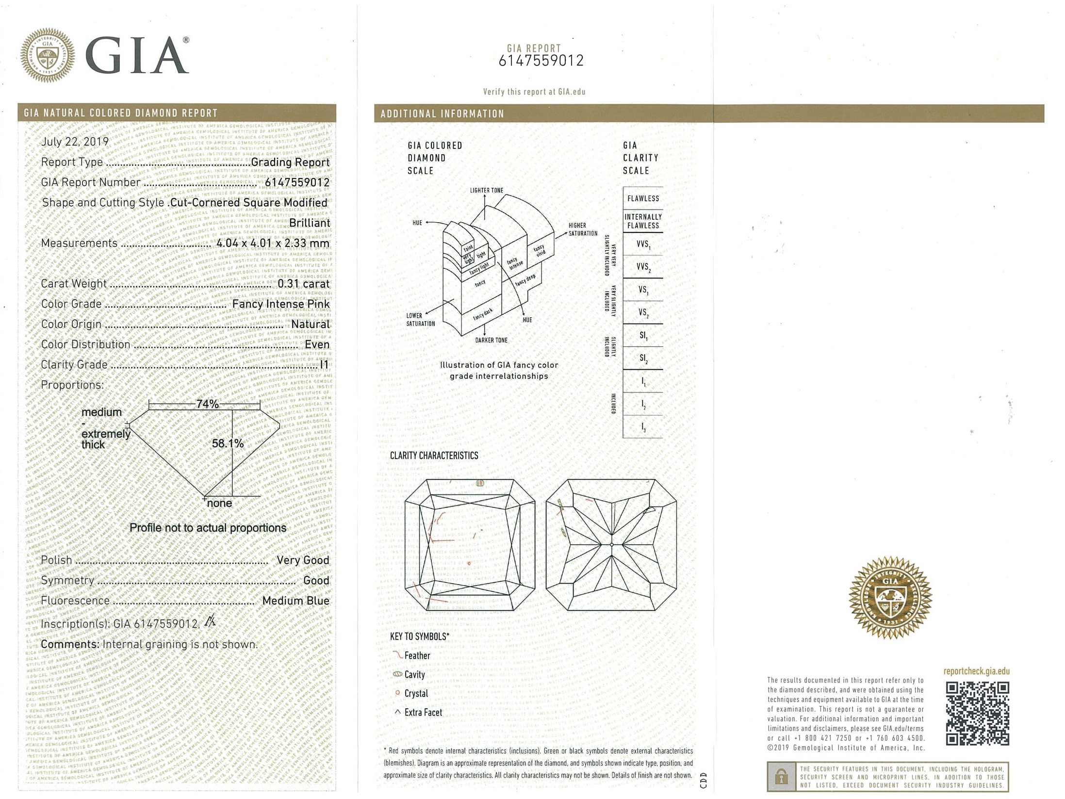 A loose Radiant Cut Argyle Diamond of 0.31ct (with GIA report graded as Natural Fancy Intense Pink P1 #6147559012). (New)