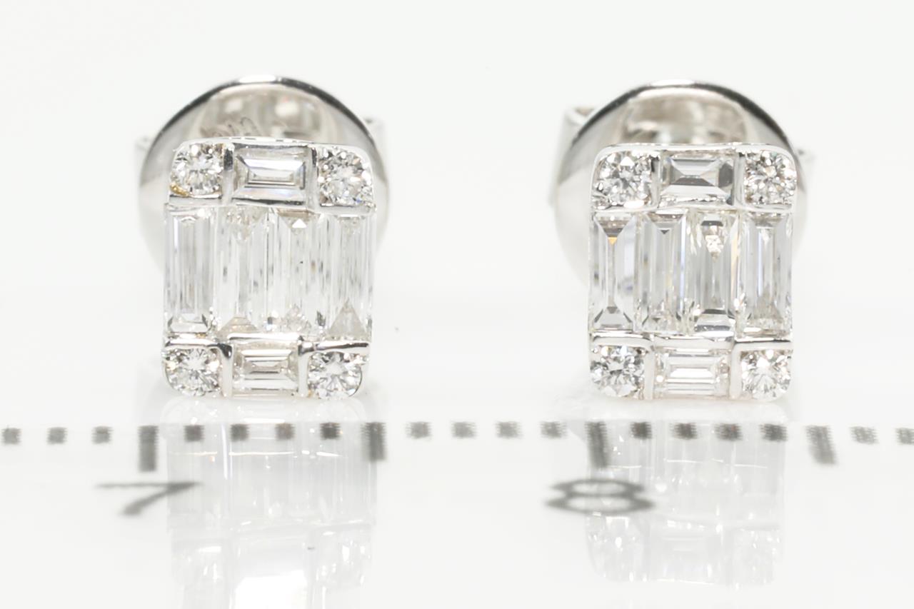 Diamond Earrings with round and baguette cut Diamonds totalling 0.31cts (Estimated grading: G VS). 18ct white gold. Weight: 1.6g. (Pre-owned)