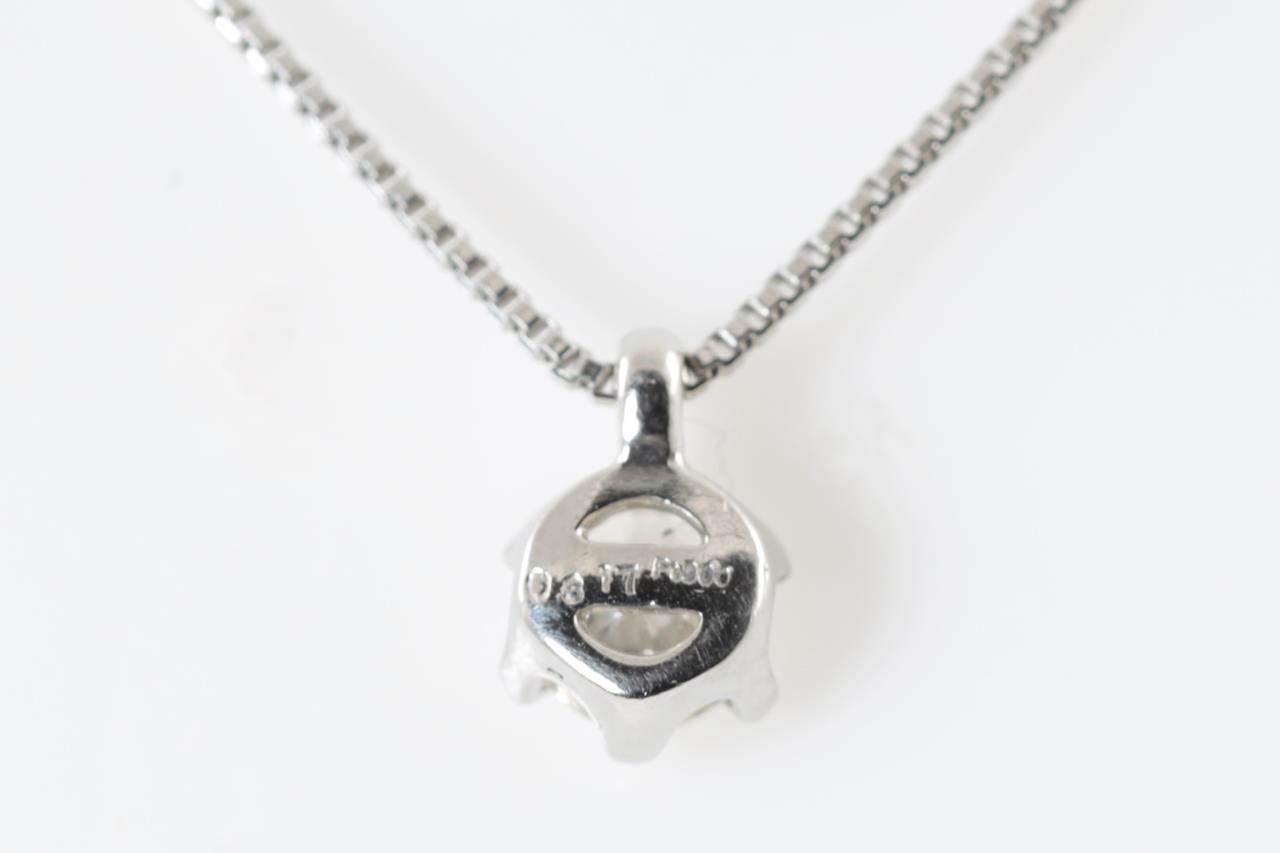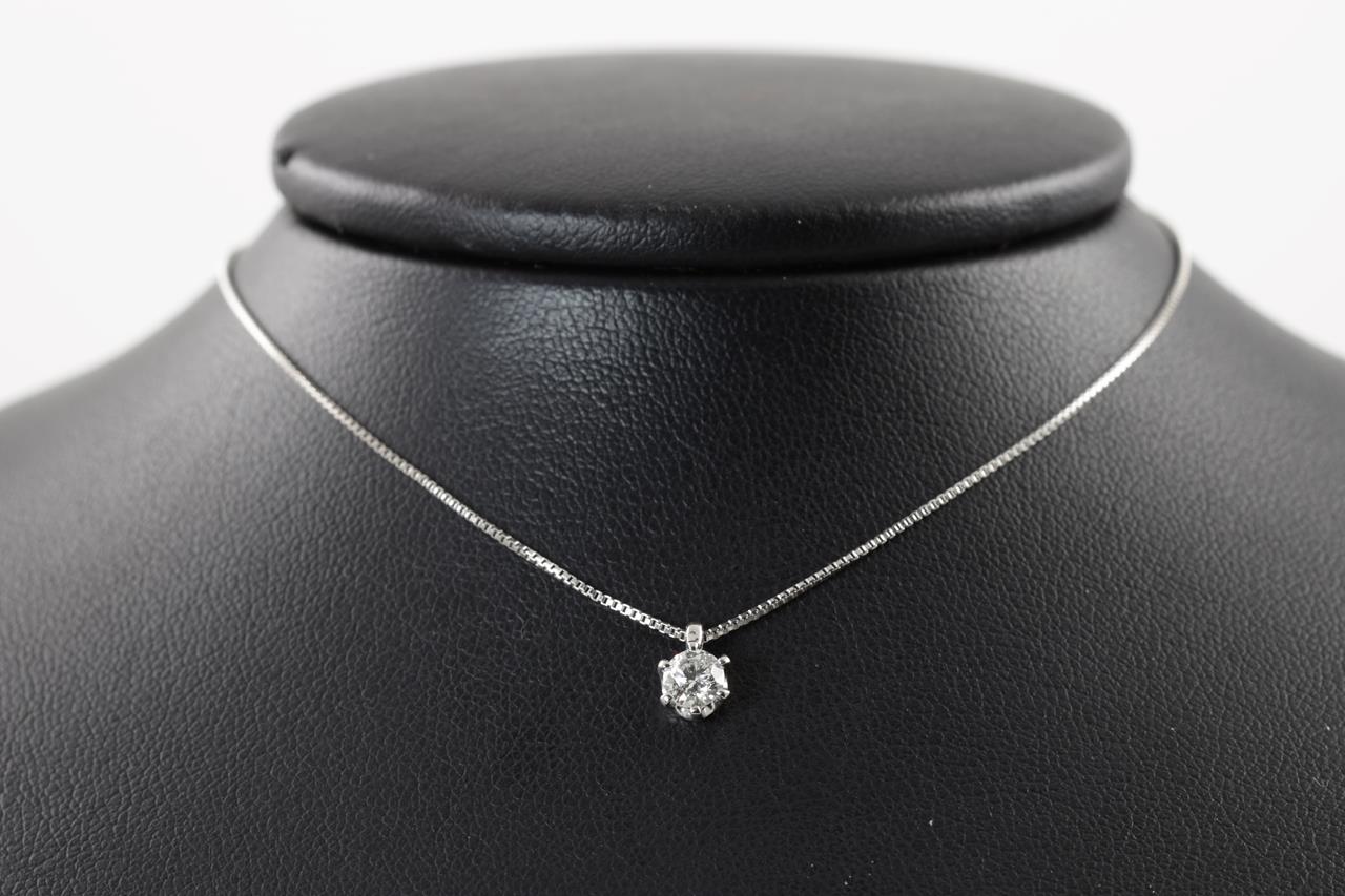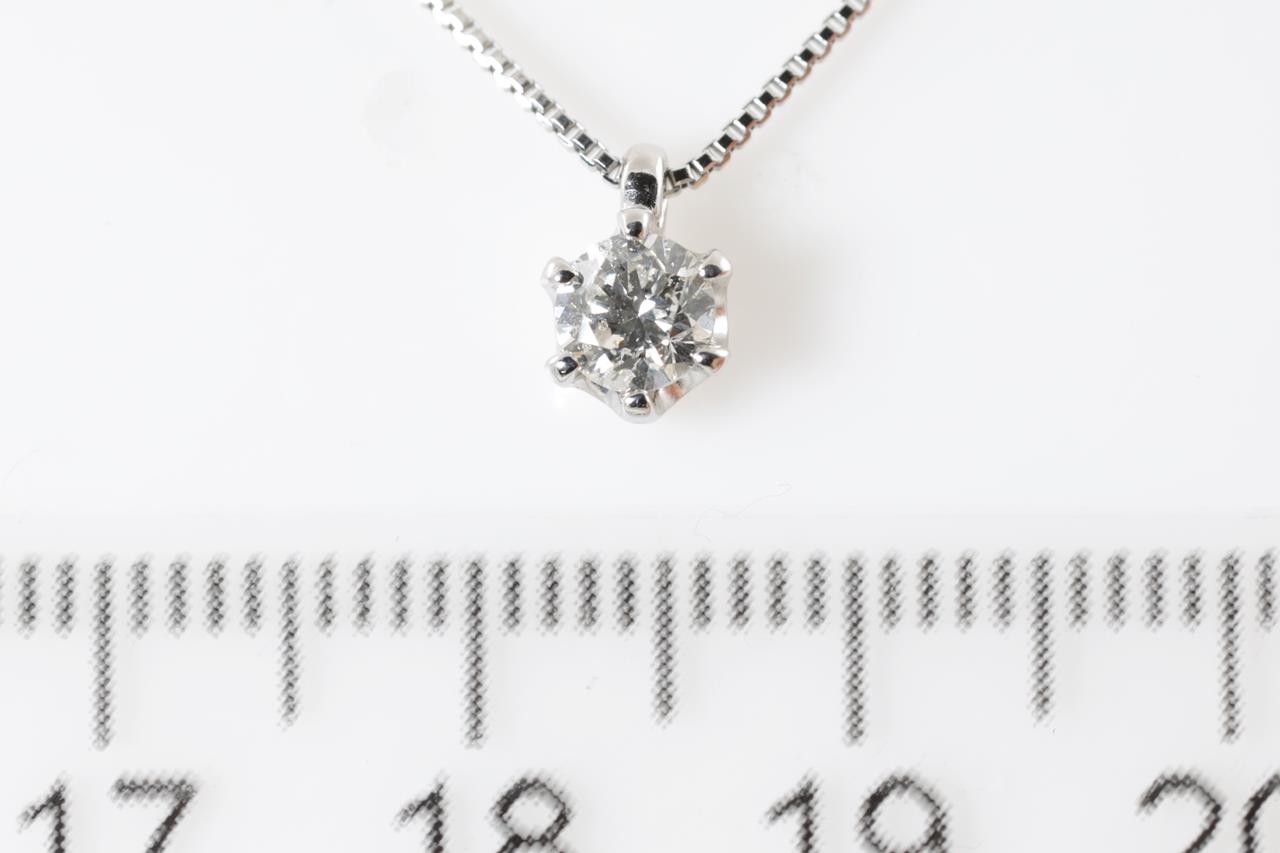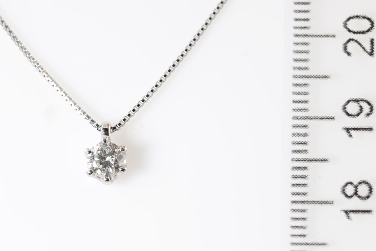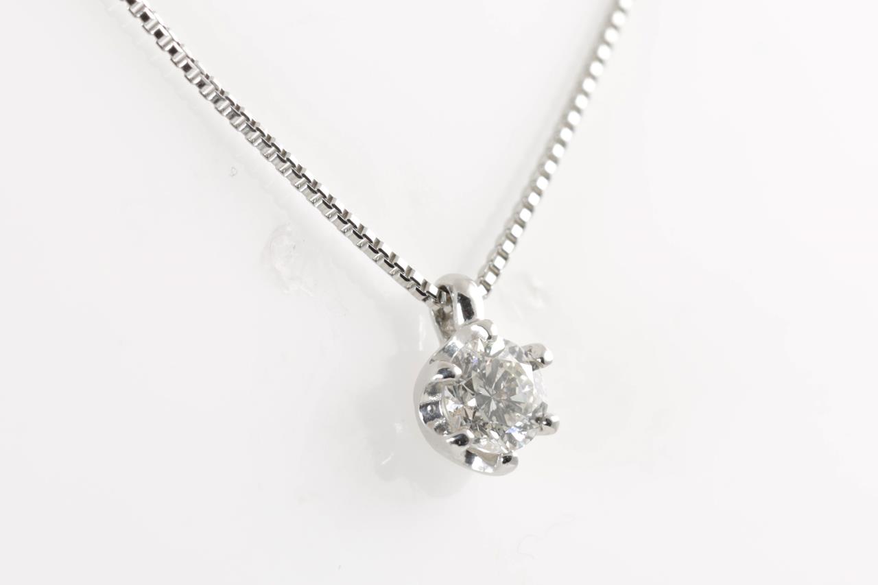 Diamond solitaire pendant with a round brilliant cut Diamond of 0.31ct (Estimated grading: I-J P1-2). Platinum with 39cm chain. Weight: 2.7g. (Pre-owned)