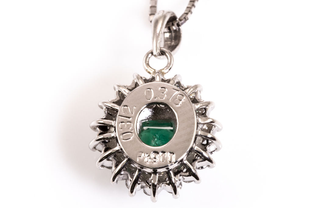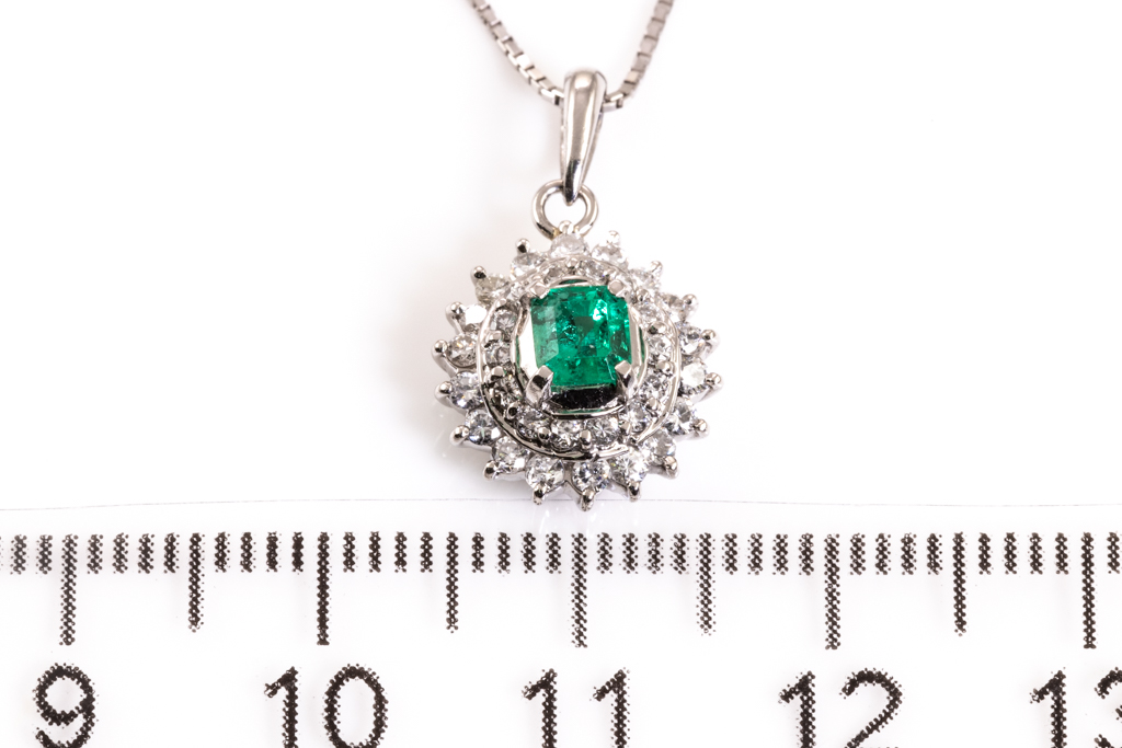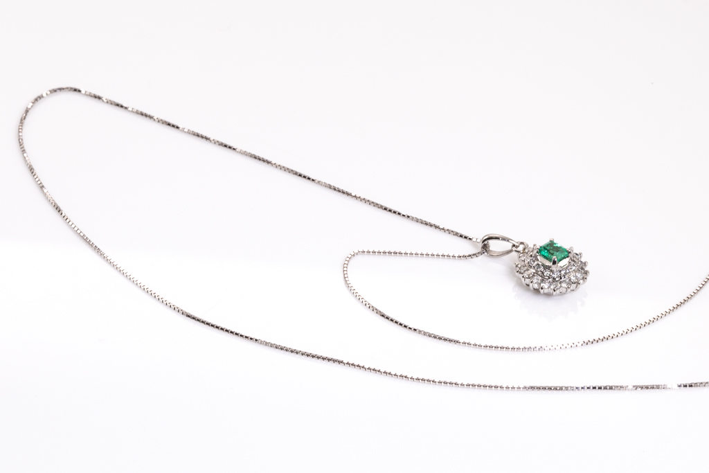 Emerald and Diamond pendant with emerald cut Emerald of 0.31ct and round Diamonds totalling 0.37cts (Estimated grading: G SI-P1). Platinum with 18ct white gold adjustable 44cm chain. Weight: 4.4g. (Pre-owned)