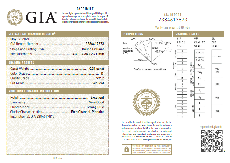 A loose round brilliant cut Diamond of 0.31ct (with GIA report graded as D VVS2 #2384617873). (New)