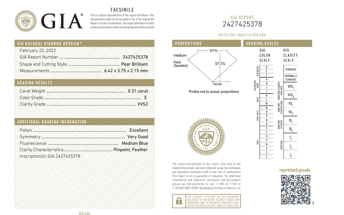 A loose pear shape Diamond of 0.31ct (with GIA summary report graded as E VVS2 #2427425378). (New)