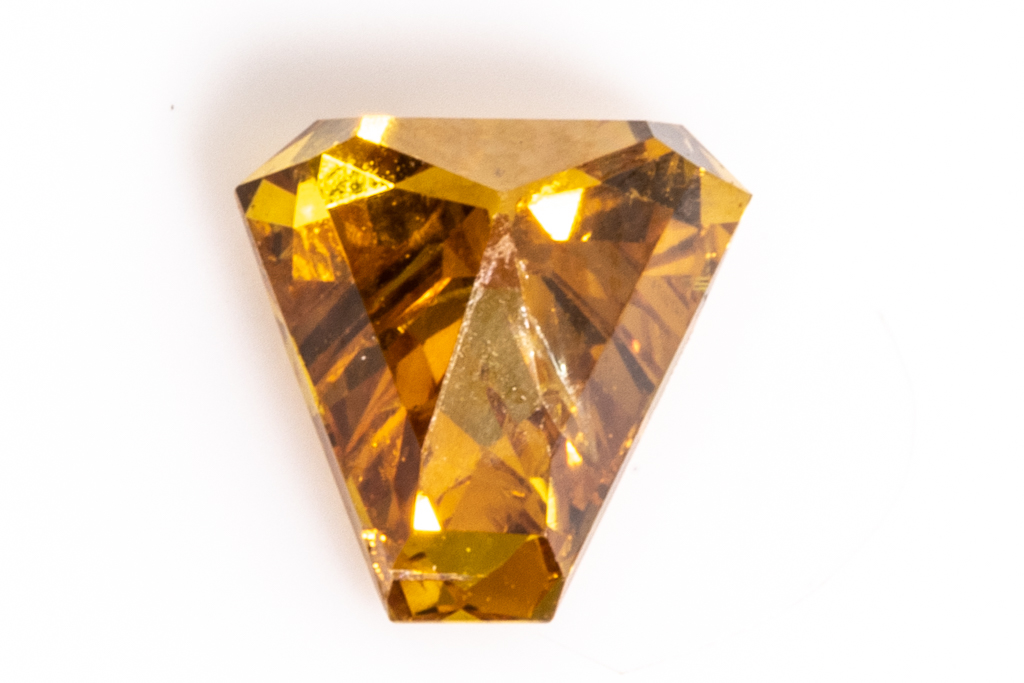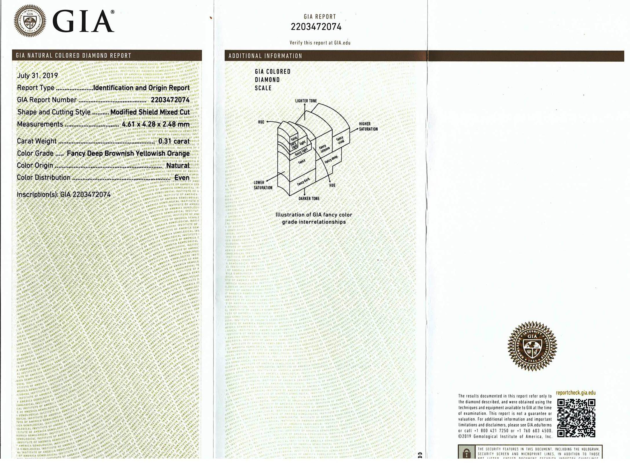 A loose shield shape fancy cut Diamond of 0.31ct (with GIA report graded as Natural Fancy Deep Brownish Yellowish Orange Even #2203472074). FSA estimated clarity grade: P1. (New)