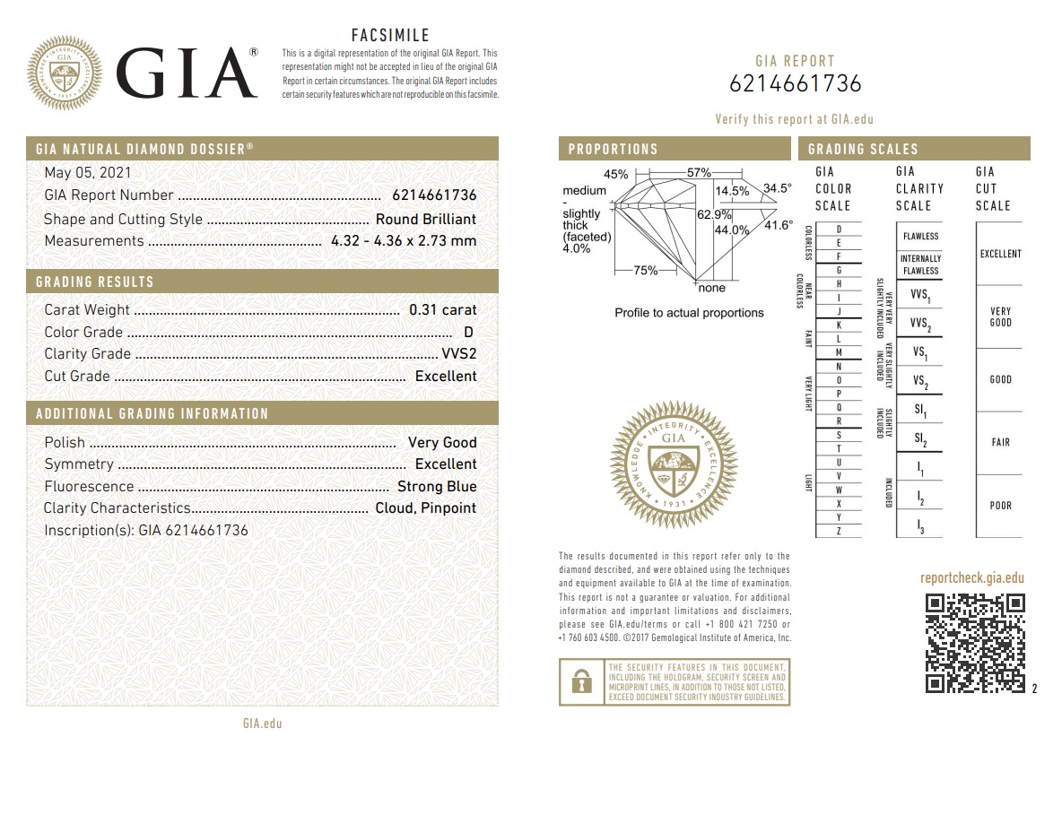 A loose round brilliant cut Diamond of 0.31ct (With GIA summary report graded as D VVS2 #6214661736). (New)