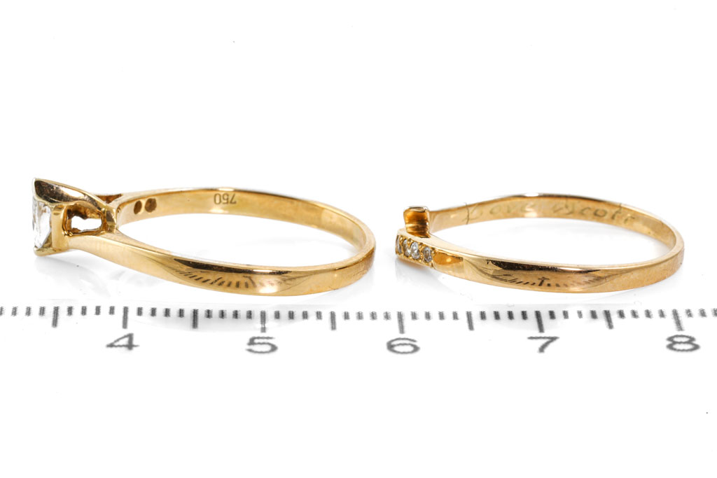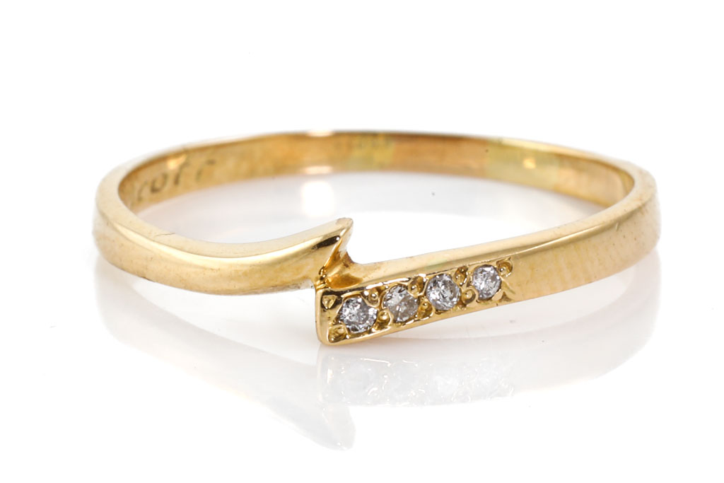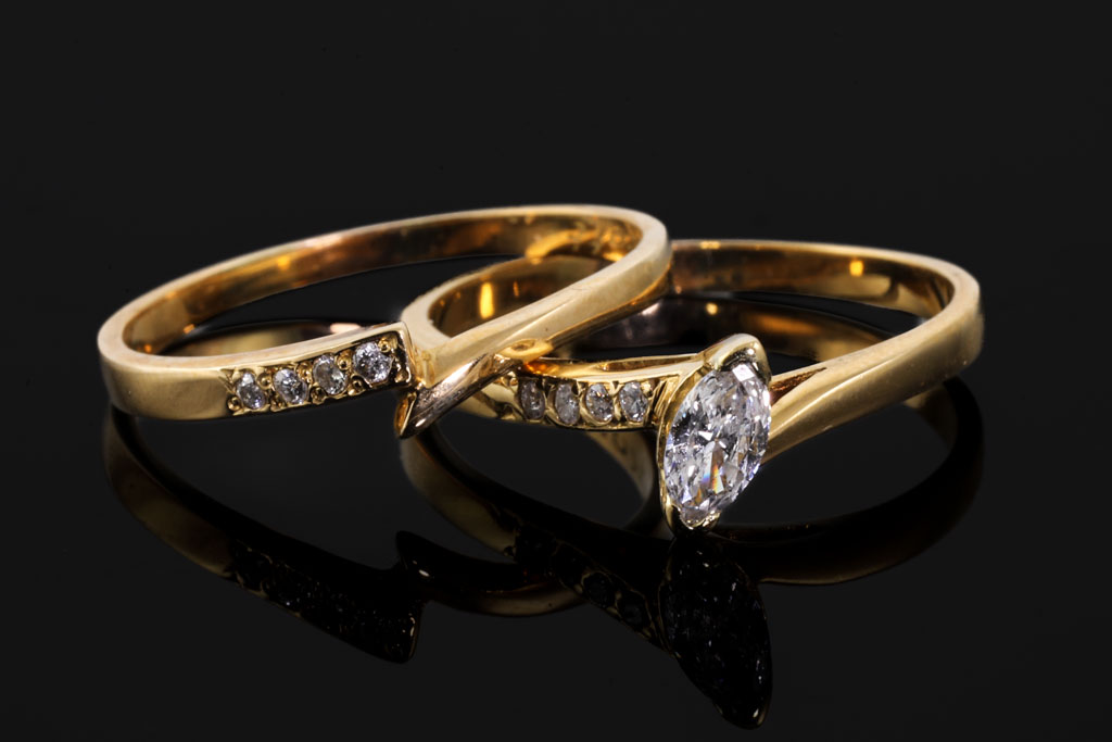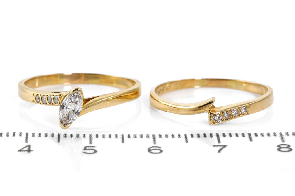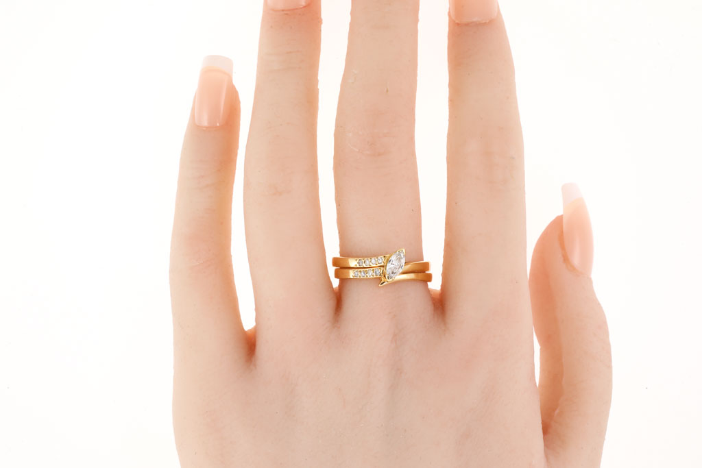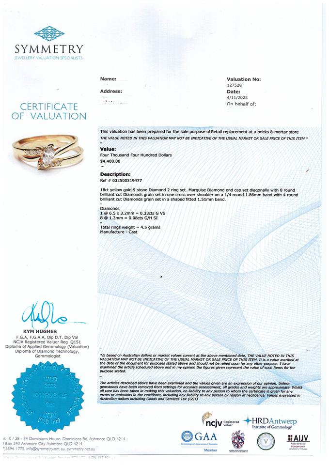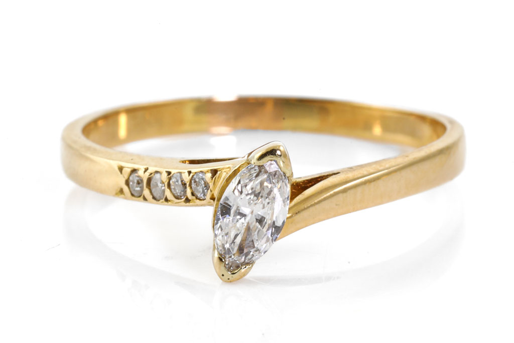 Diamond engagement ring ring set with centre marquise cut diamond totalling 0.33cts (Estimated grading: G VS) and round Diamonds of 0.08ct. 18ct yellow gold. Ring size P 1/2. Weight: 4.5g. With Valuation Certificate #032500319477.
