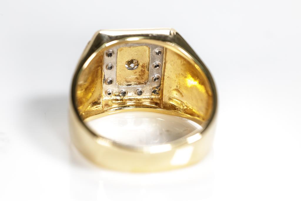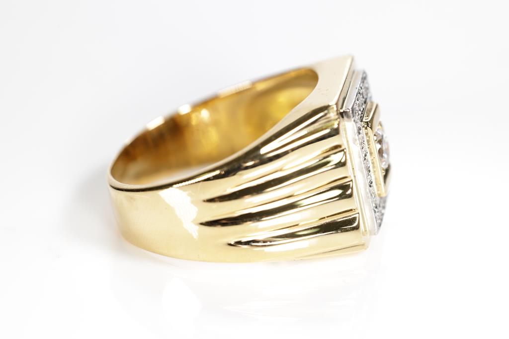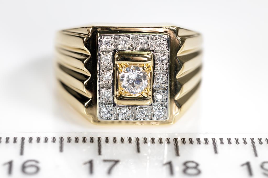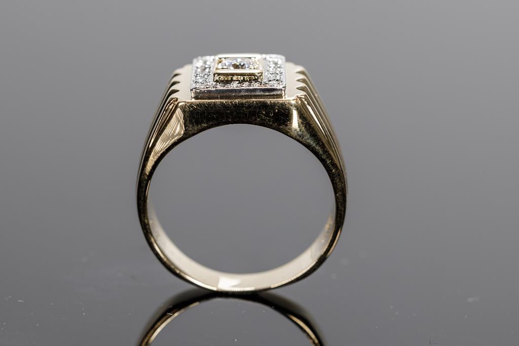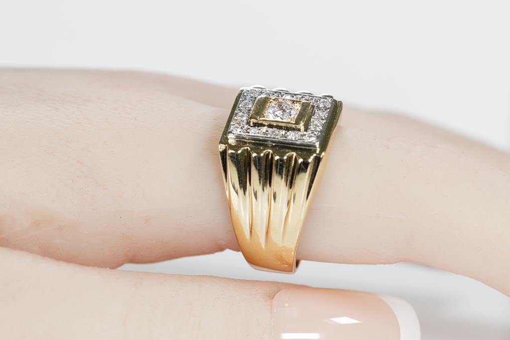 Mens ring with a centre round Diamond of 0.21ct and remaining round Diamonds totalling 0.12cts. 18ct yellow gold & platinum. Ring size R1/2. Weight: 11.2g. (Pre-owned)