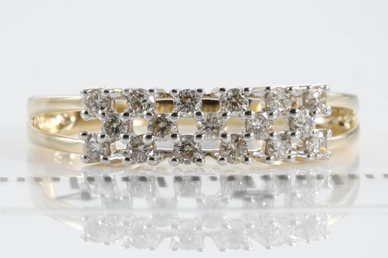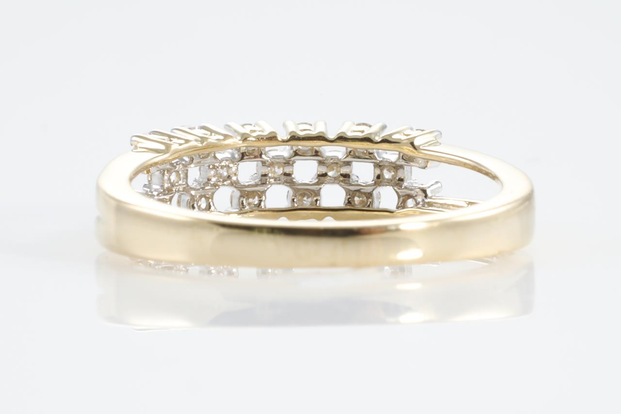 Diamond ring with round Diamonds totalling 0.33cts (Estimated grading: H SI). 14ct yellow gold. Ring size: L1/2 - Ring resizing is not recommended. Weight: 2.3g (New).