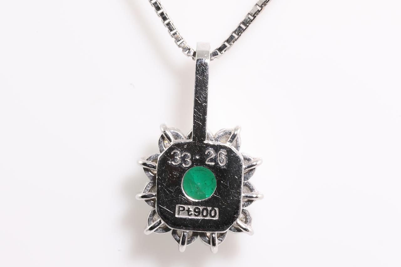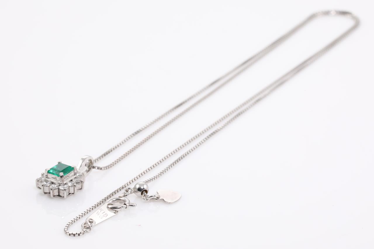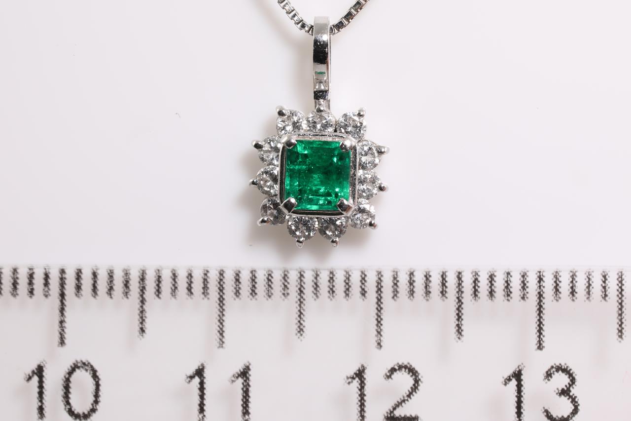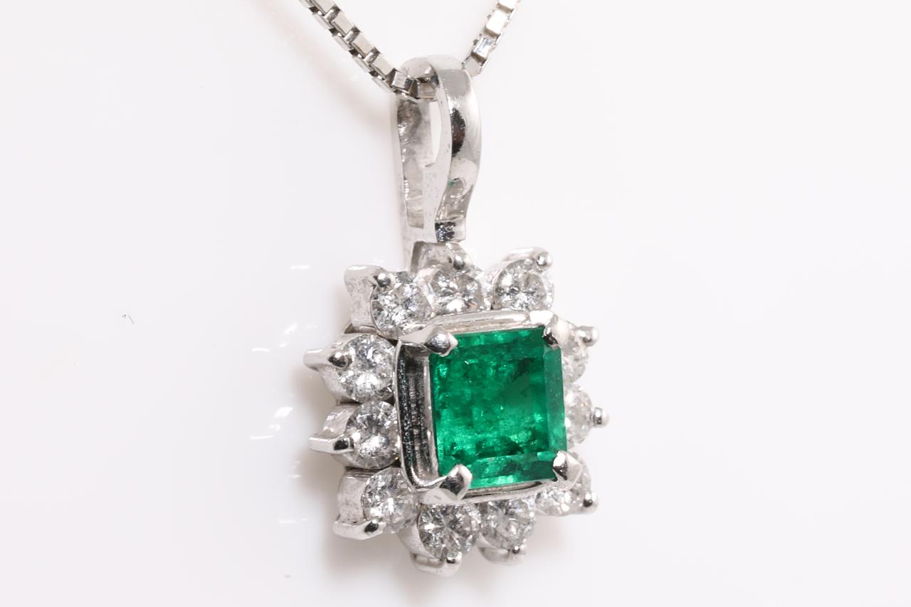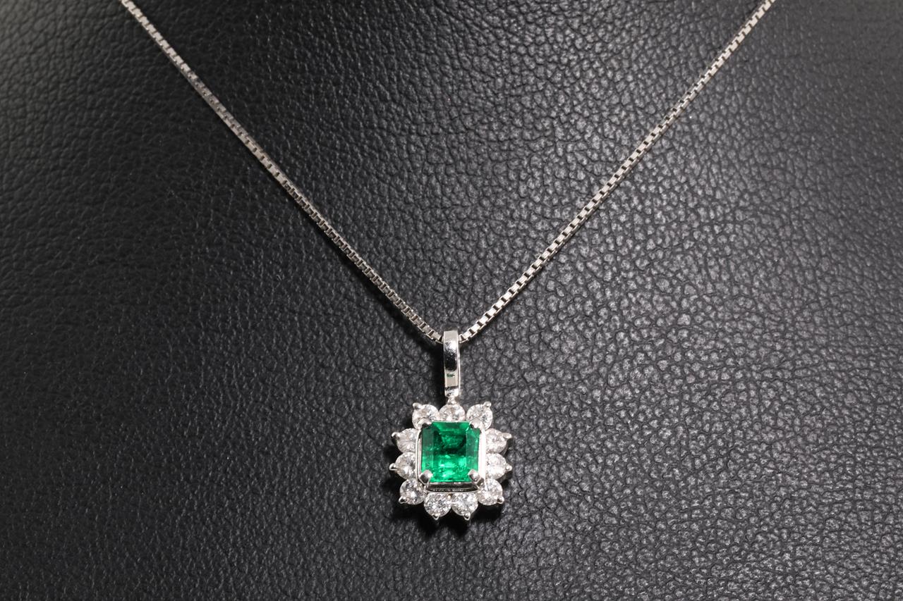 Emerald and Diamond pendant with Emerald of 0.33ct and Diamonds totalling 0.26cts. Platinum with 18ct white gold adjustable 45cm chain. Weight: 3.6g (Pre-owned)