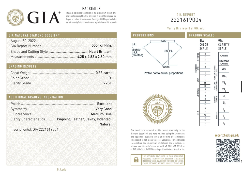 A loose heart shaped Diamond of 0.33ct (with GIA summary report of D VVS1 #2221619004). (New)