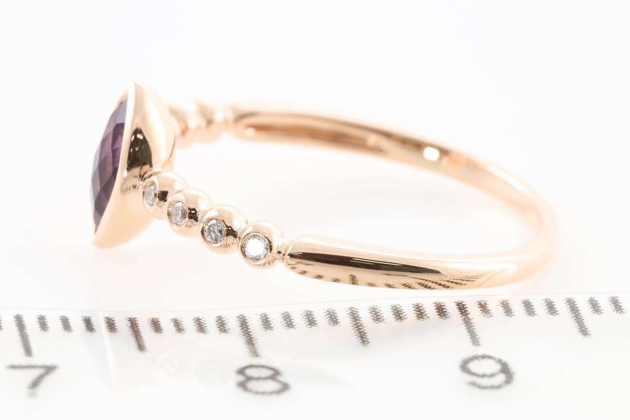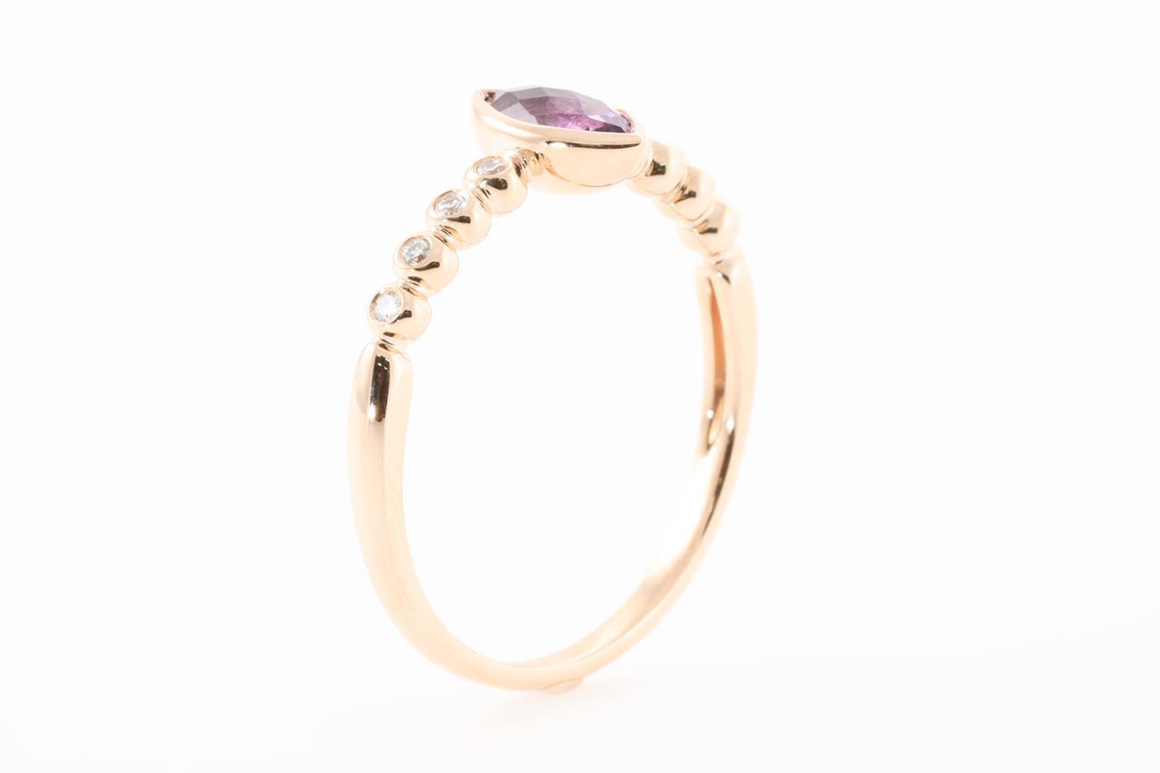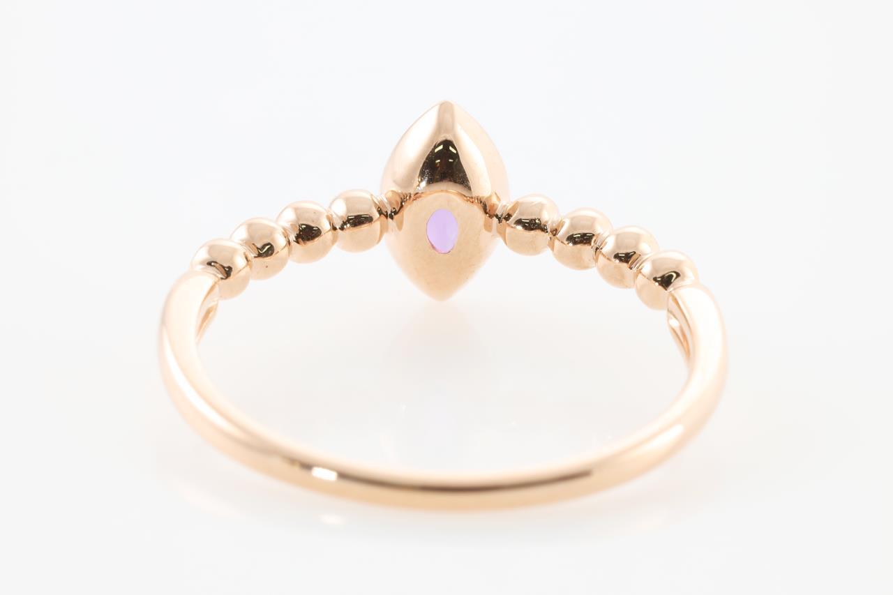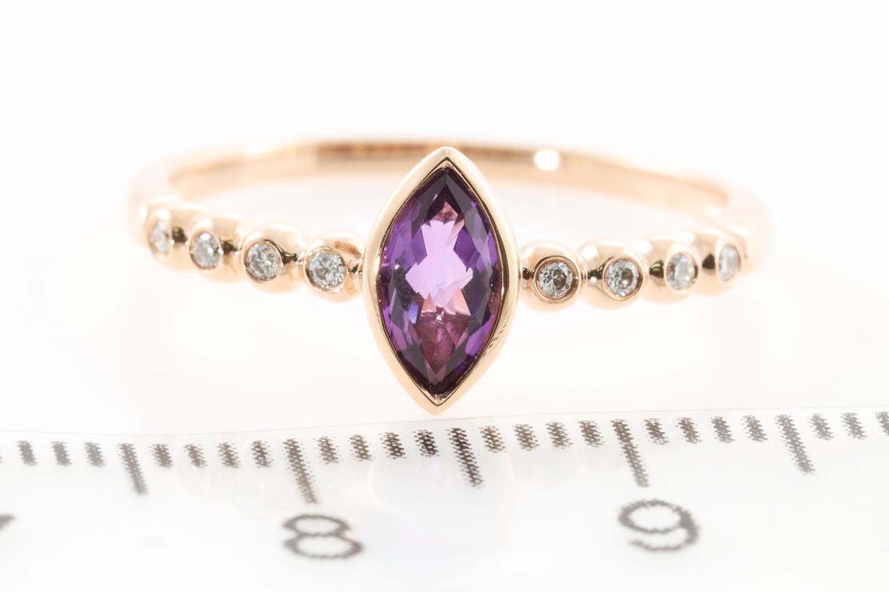 Amethyst and Diamond ring with marquise cut Amethyst of 0.35ct and Diamonds totalling 0.06cts. 14ct Rose gold. Ring size N1/2 - Note this ring cannot be reized. Weight: 1.8g (New)
