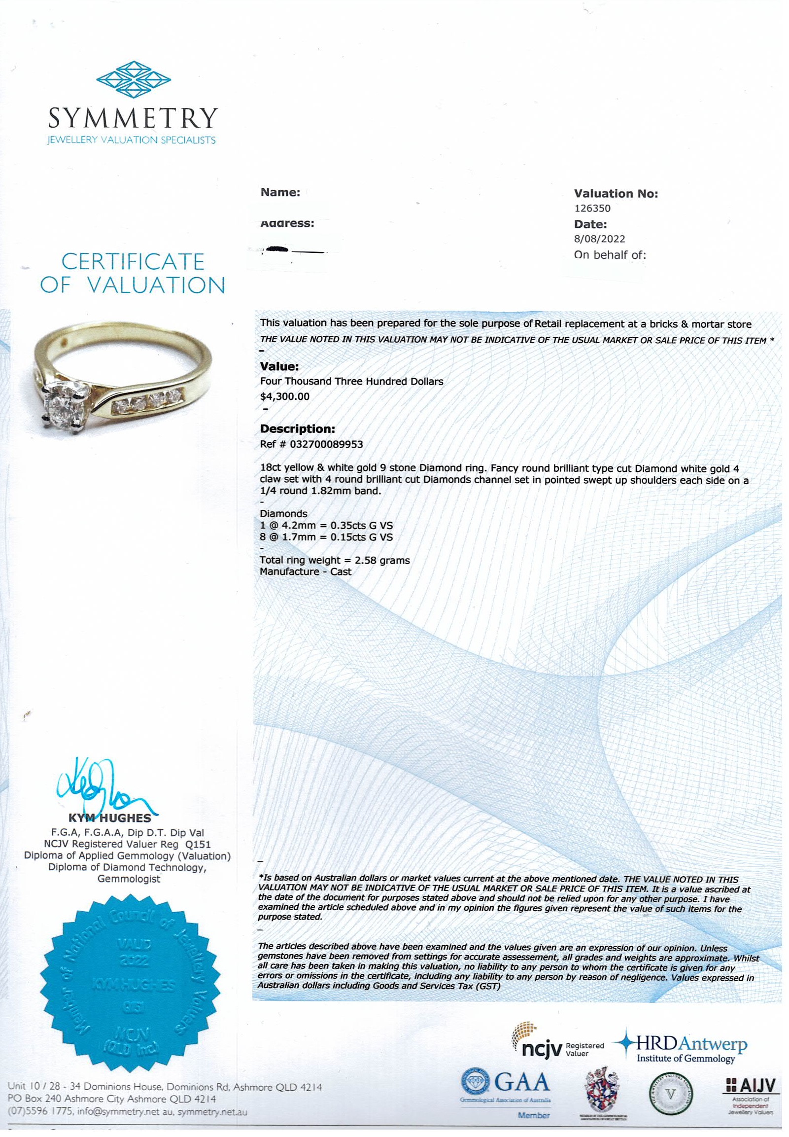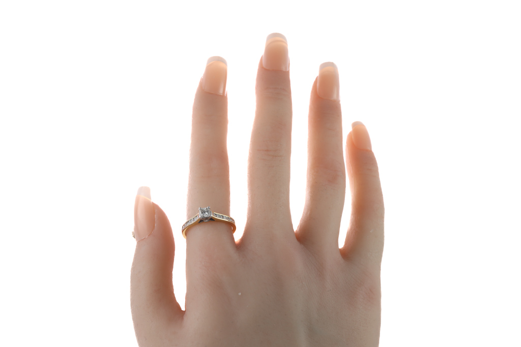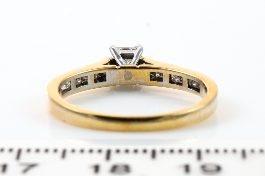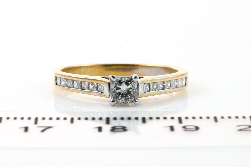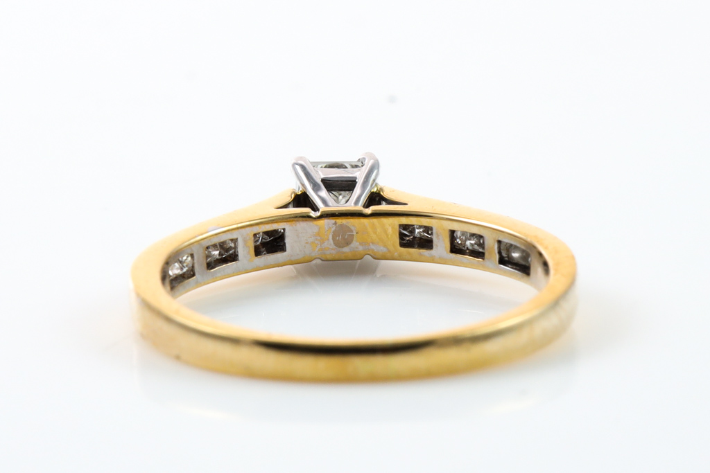 Diamond engagement ring with centre princess cut Diamond of 0.35cts and side diamonds totalling 0.15cts. 18ct yellow and white gold. Ring size N 1/2. Weight: 2.8g. With Valuation Certificate #032500316070