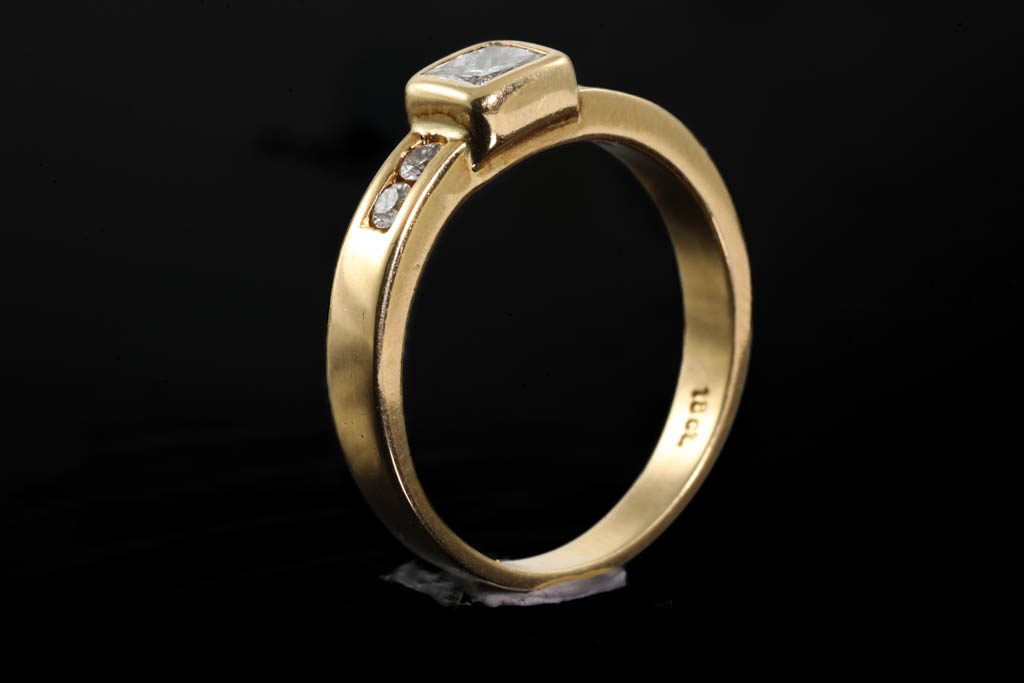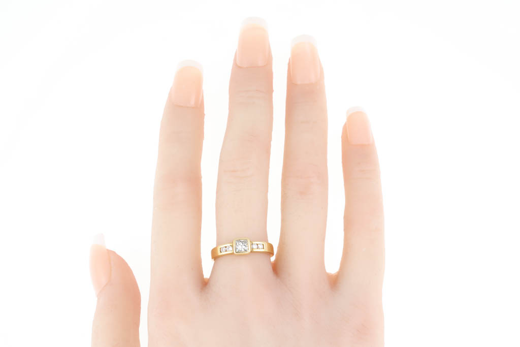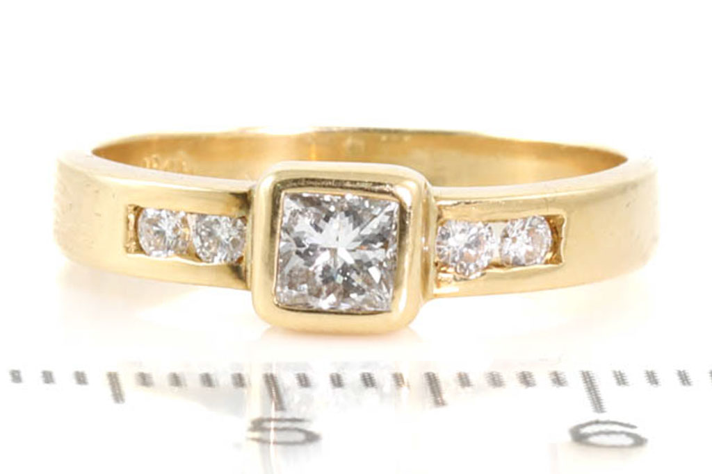 Diamond ring with centre princess cut Diamond of 0.35ct (Estimated grading: G SI) and round diamonds totalling 0.16ct. 18ct yellow gold. Ring size M. Weight: 4.2g. With Valuation Certificate #032300042073.