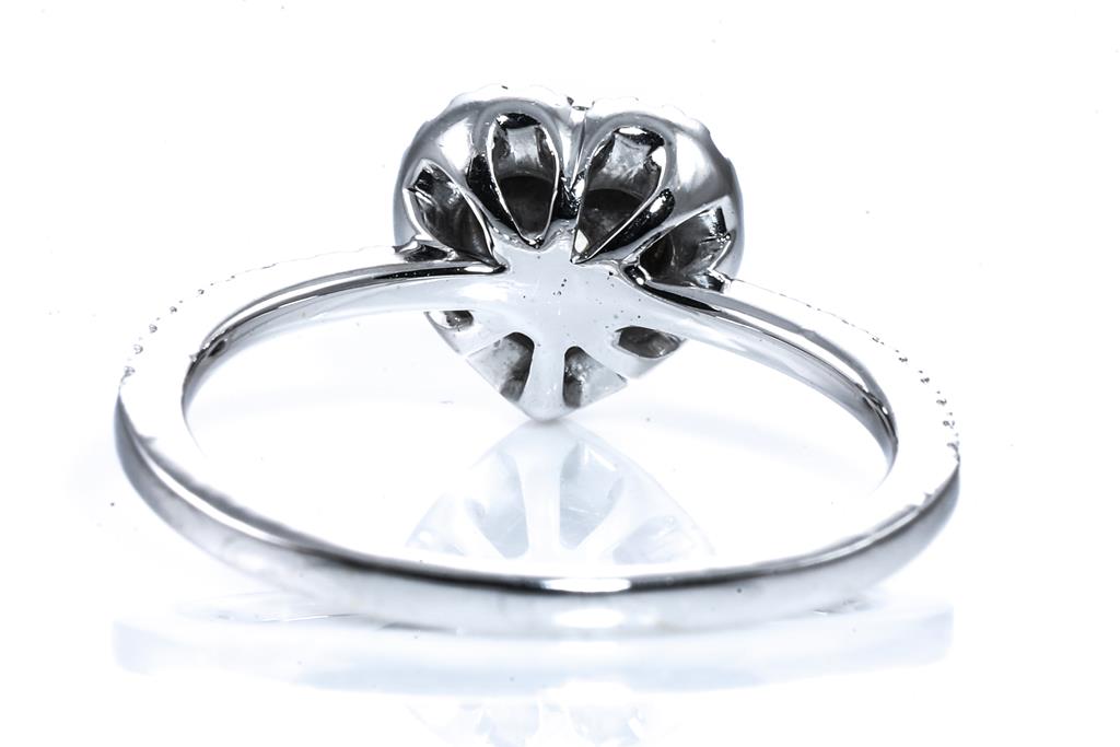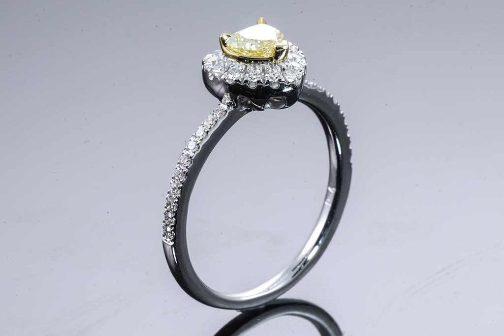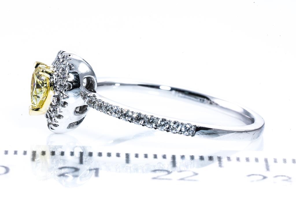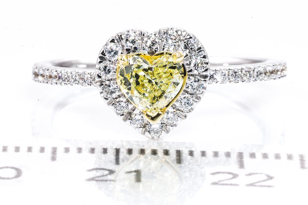 Diamond Halo ring with centre heart cut Diamond of approximately 0.35cts (Estimated grading as Fancy yellow P1) and round Diamonds totalling approximately 0.38cts (Estimated grading H-I SI). 18ct white and yellow gold. Ring size P. Weight 4.4g. (Pre-owned)