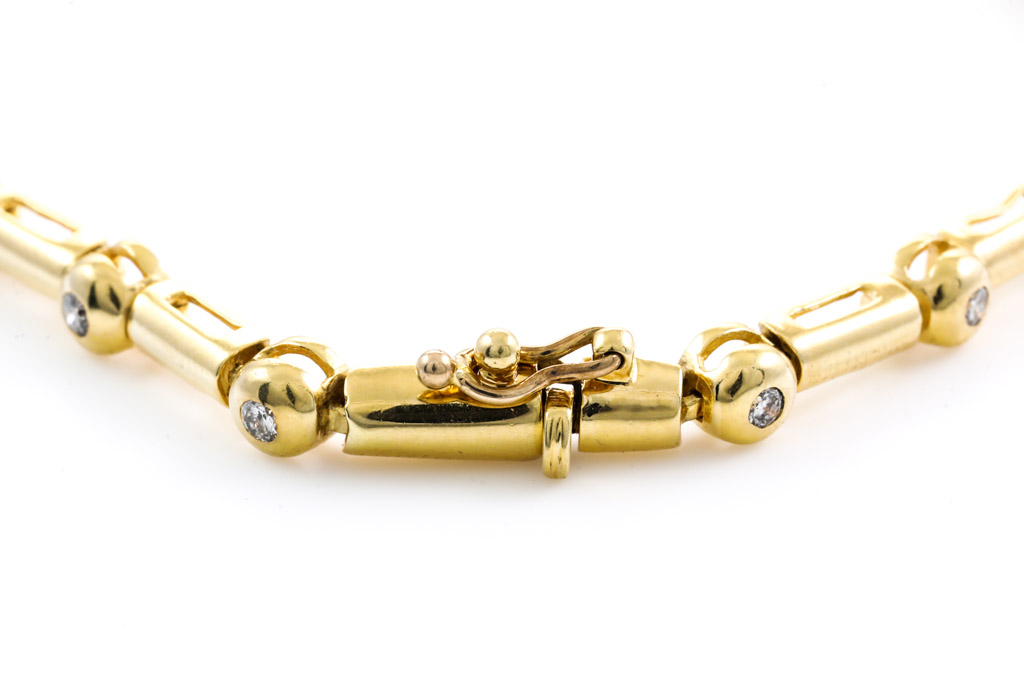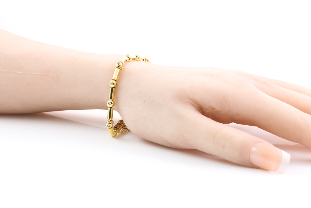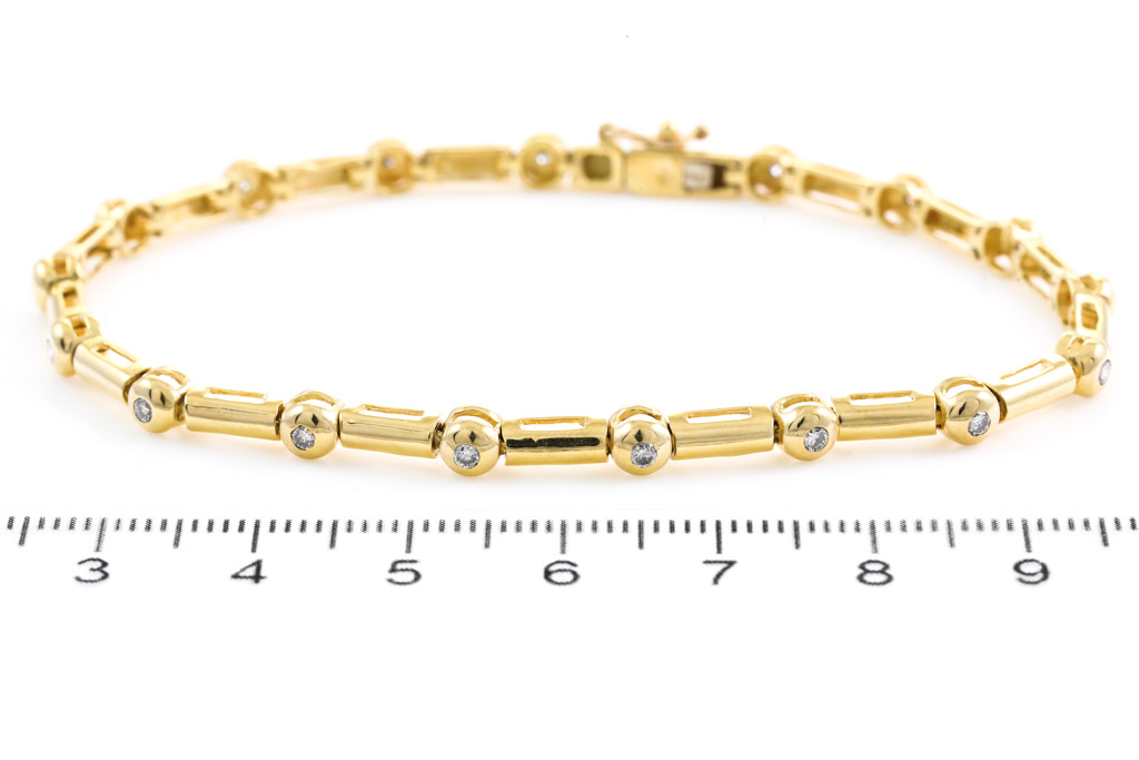 Diamond bracelet with 17 round Diamonds totalling approximately 0.35cts (Estimated grading: G-H P1). 18ct yellow gold. Length: 20cm. Weight: 13.3g (Pre-owned)