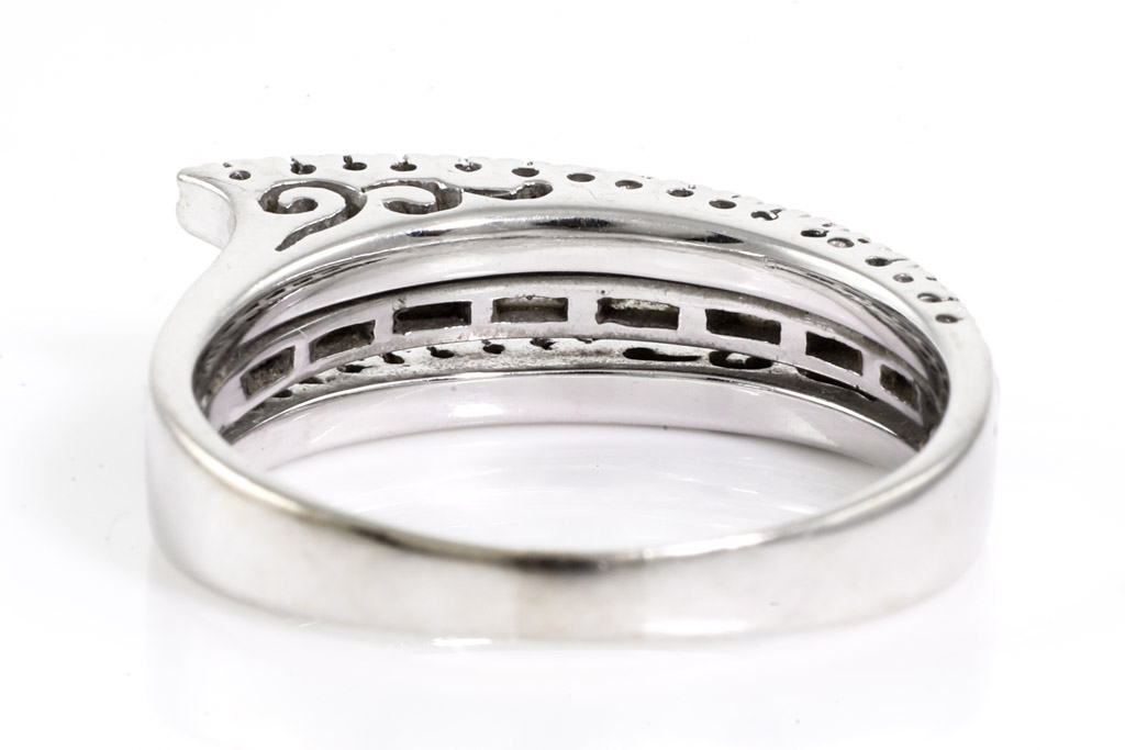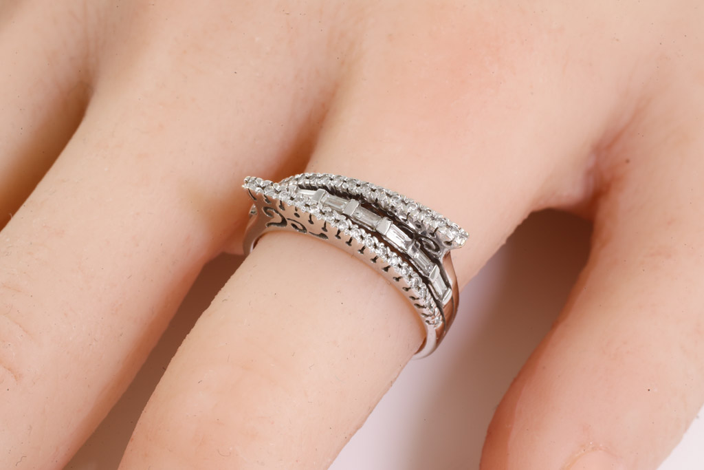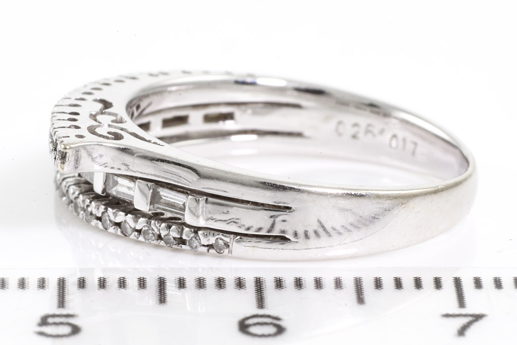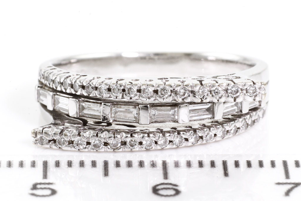 Diamond dress ring with round & baguette cut Diamonds totalling approximately 0.35cts (Estimated grading: H SI). 18ct white gold. Ring size: N1/2. Weight: 5.5g. (Pre-owned)