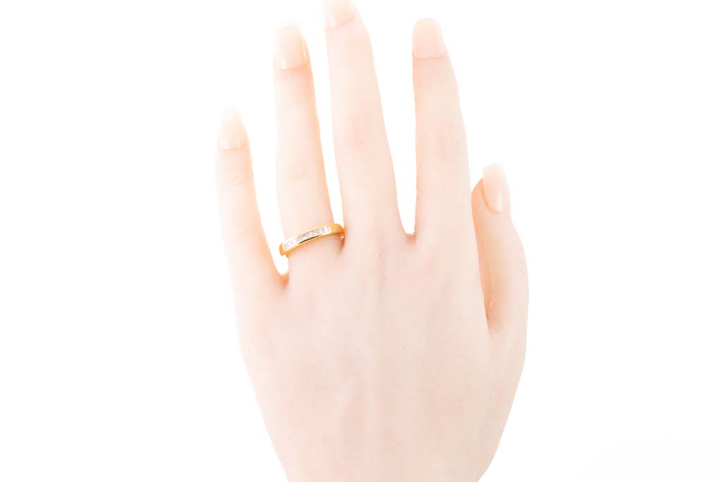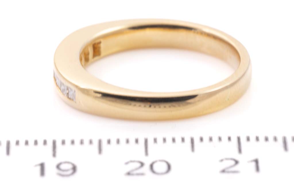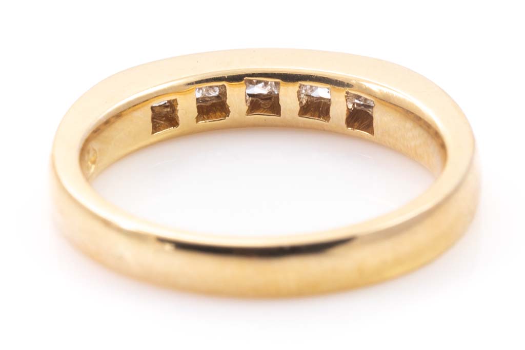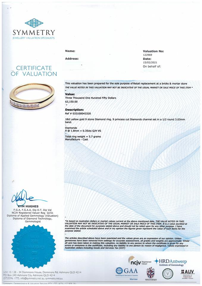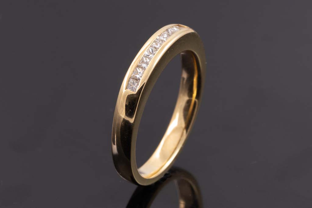 Diamond eternity ring with princess cut Diamonds totalling 0.35cts (Estimated grading: G-H VS). 18ct yellow gold. Ring size O- ring resizing not recommended. Weight: 5.7g. With Valuation Certificate #033100043320.