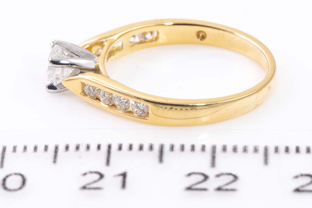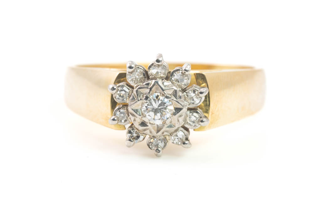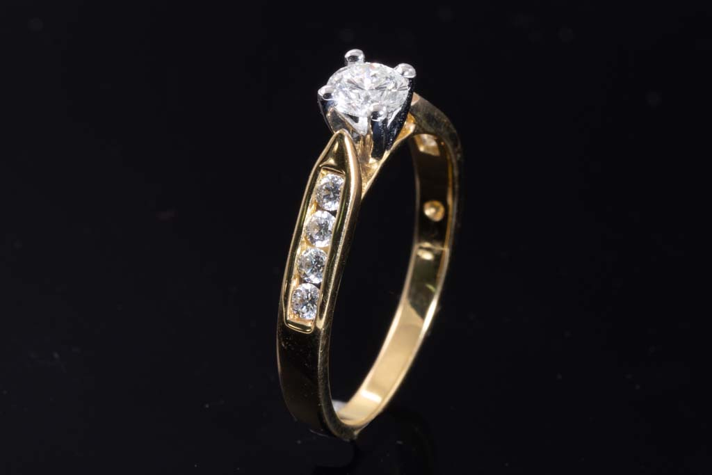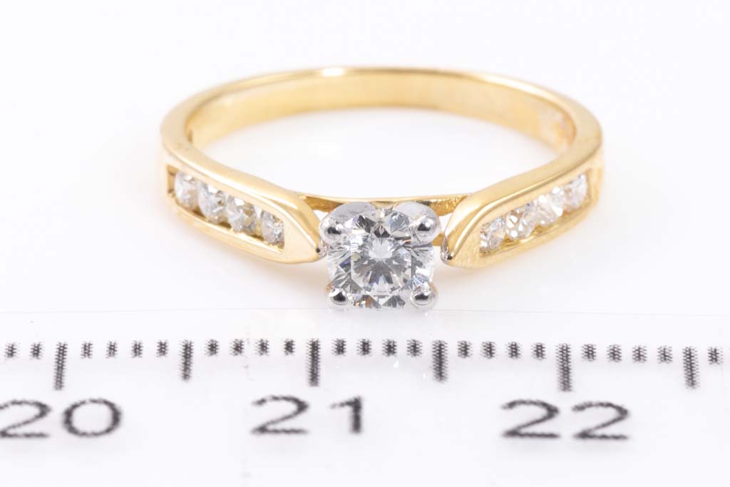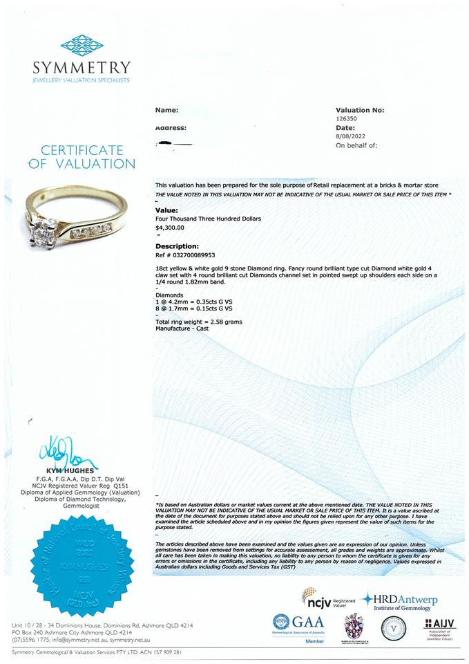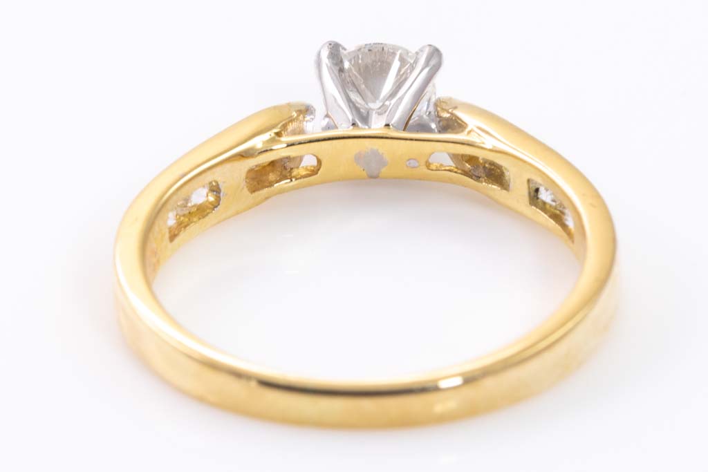 Diamond Solitaire ring with centre round Diamond of 0.35cts (Estimated grading: G VS) and surrounding diamonds totalling 0.15cts. 18ct yellow and white gold. Ring size K. Weight: 2.6g With Valuation Certificate #032700089953.