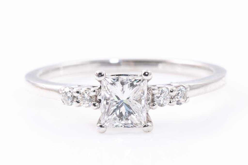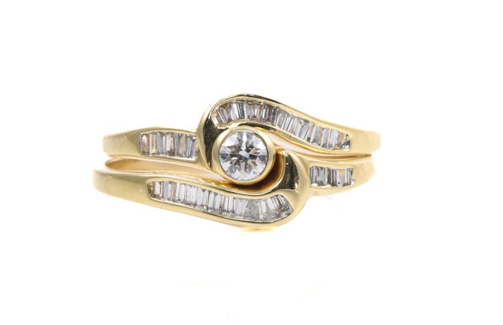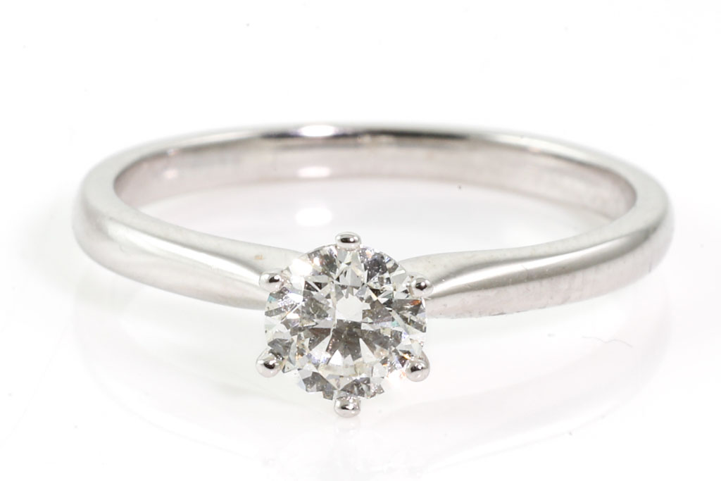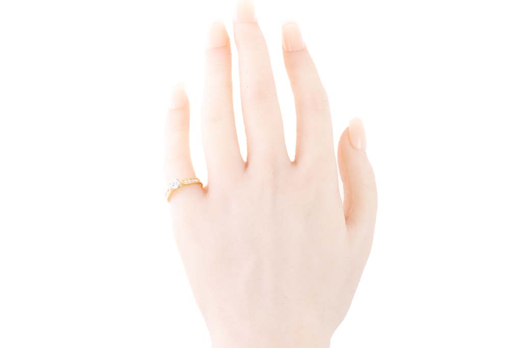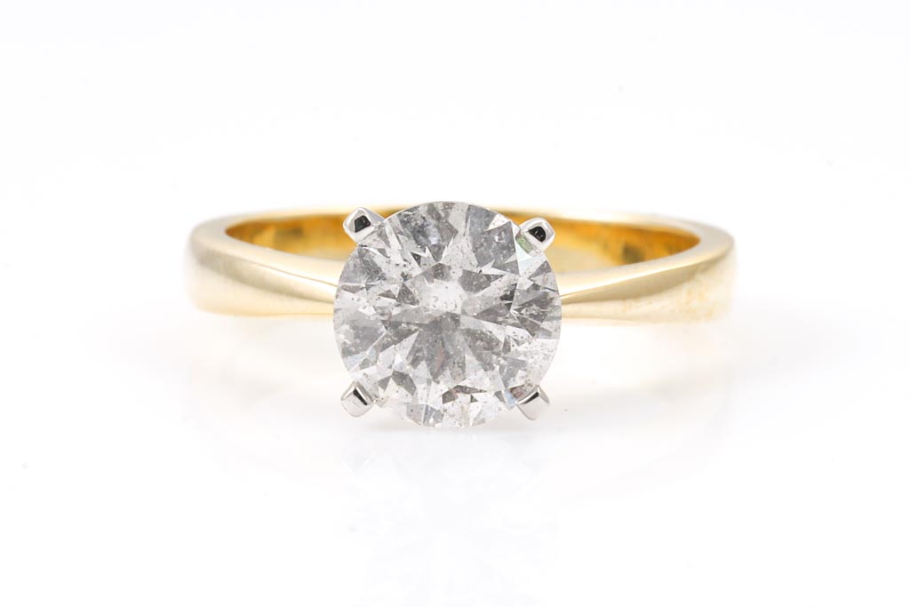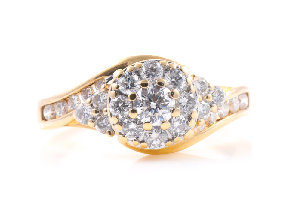 Diamond Solitaire ring with centre round Diamond of 0.35cts (Estimated grading: G VS) and surrounding diamonds totalling 0.15cts. 18ct yellow and white gold. Ring size K. Weight: 2.6g With Valuation Certificate #032700089953.