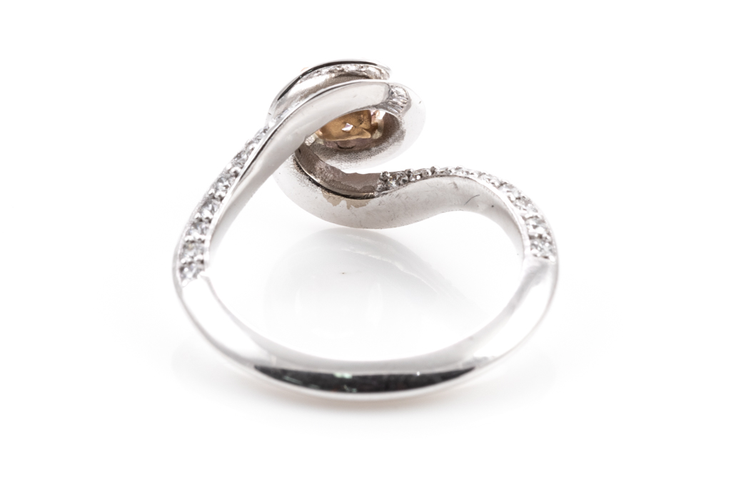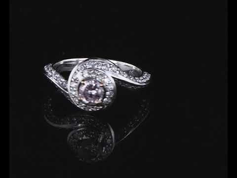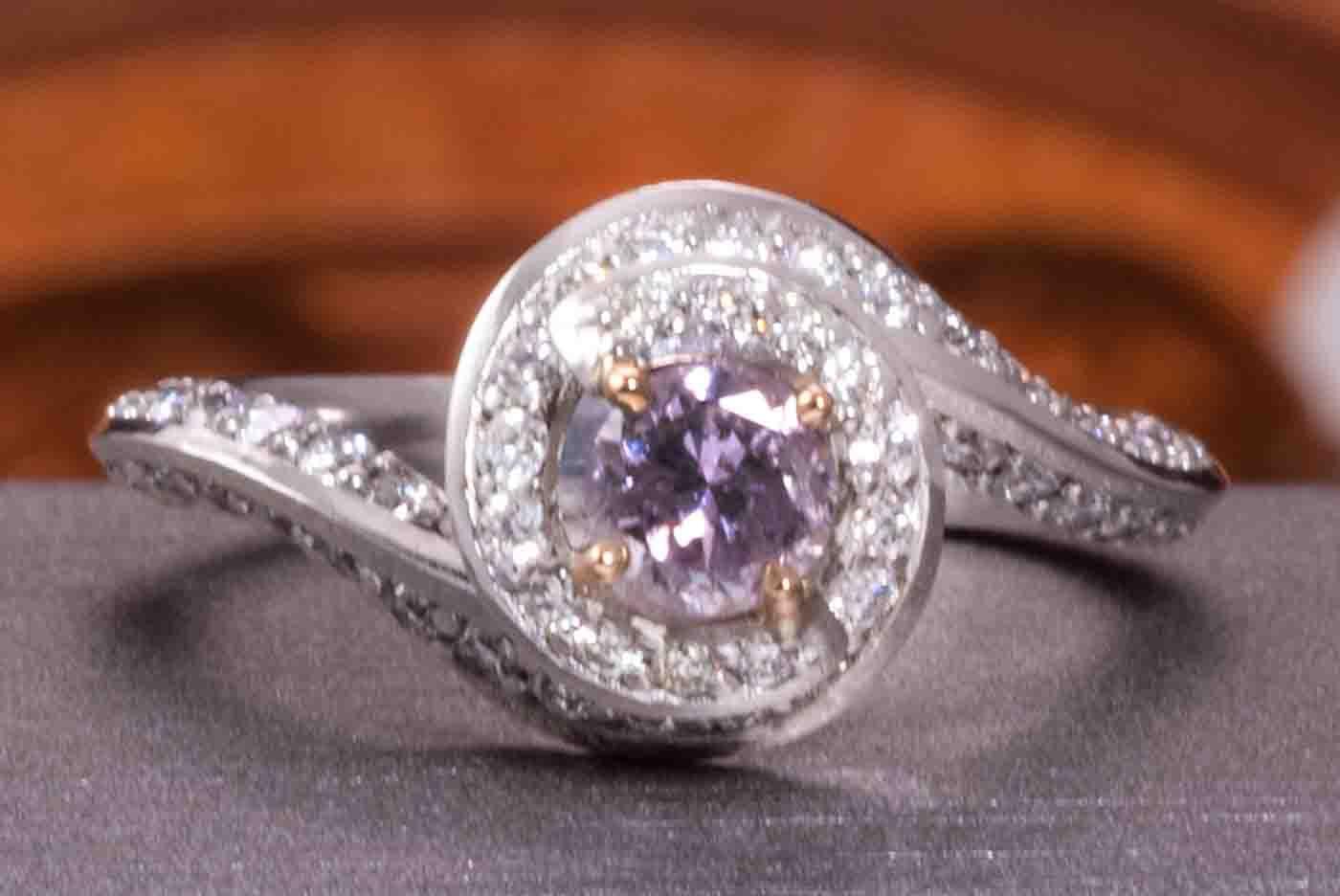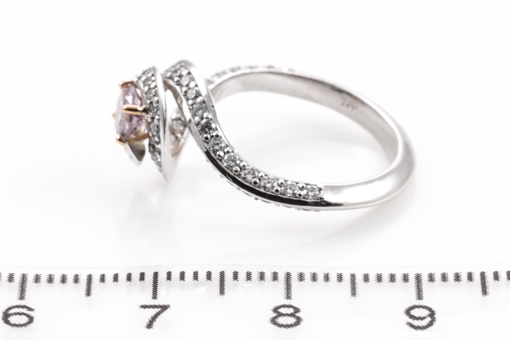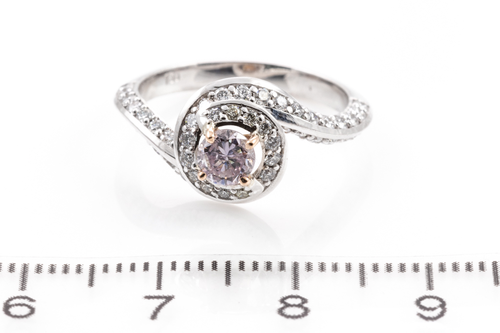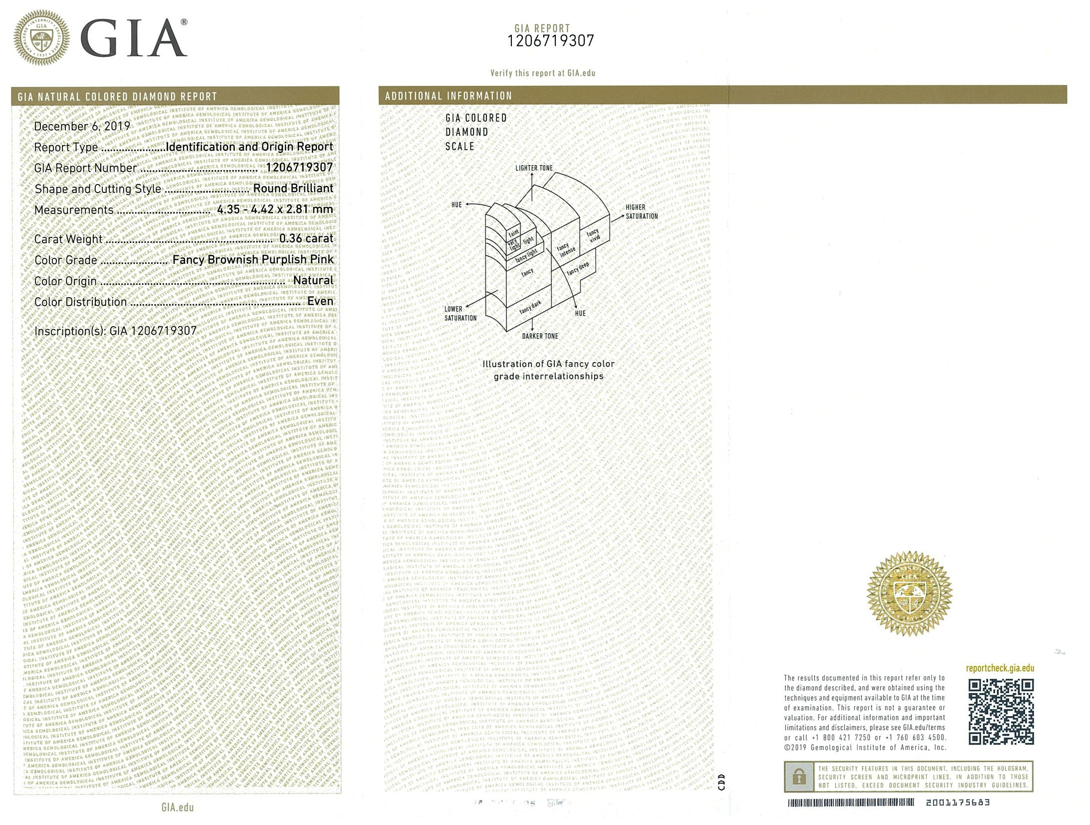Diamond ring with centre round brilliant cut Diamond of 0.36ct (with GIA report graded as Natural Fancy Brownish Purplish Pink Even #1206719307) and surrounding round Diamonds totalling 0.60cts (Estimated grading: G SI). Ring size K - ring resizing not recommended. FSA estimated clarity grade: P2. Weight 3.4g (New)