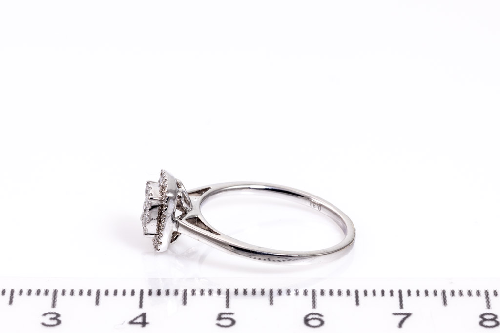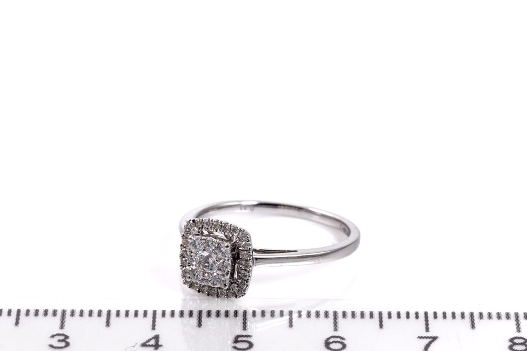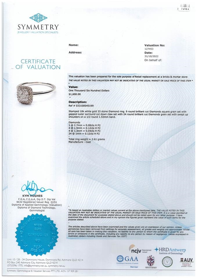 Diamond dress ring with 33 round Diamonds totalling 0.36cts (Estimated grading: H P2). 10k white gold. Ring size N1/2. Weight: 2.6g. With Certificate of Valuation Ref#033100045199. (Pre-owned)