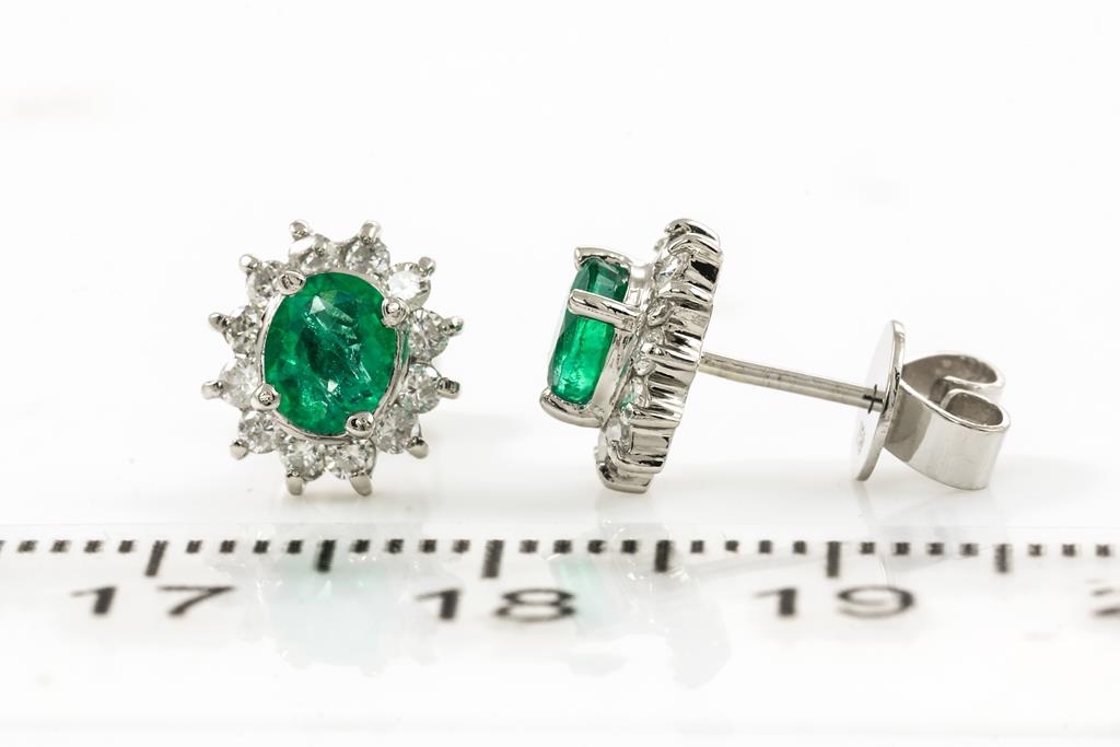 Emerald and Diamond earrings with oval shape Emeralds totalling 0.36cts and round Diamonds approximately totalling 0.16cts. Platinum with 18ct white gold backs. Weight: 2.8g. (Pre-owned)