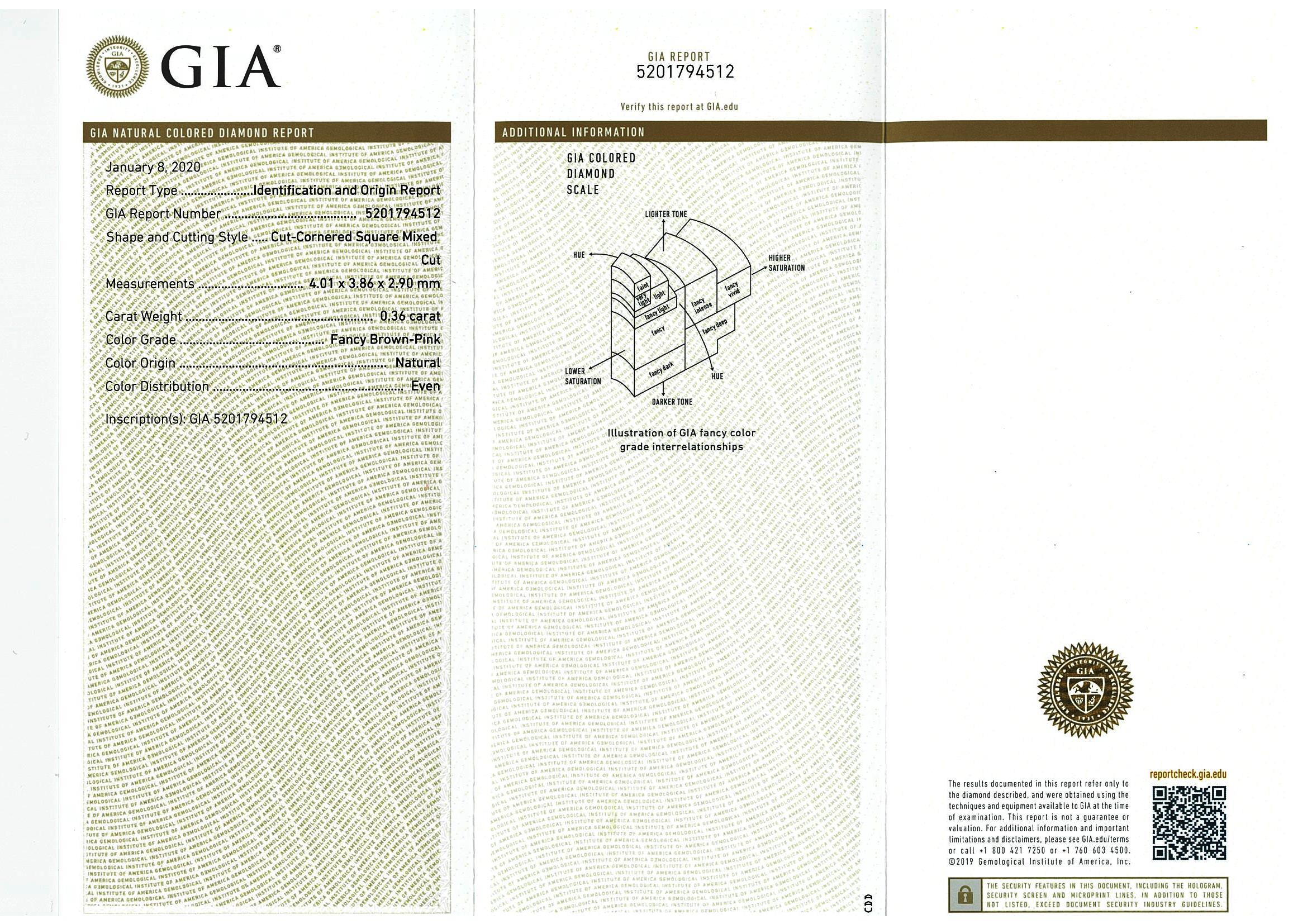 A loose radiant cut Diamond of 0.36ct (with GIA report graded as Natural Fancy Brown-Pink Even #5201794512) FSA estimated clarity grade: P1. (New)