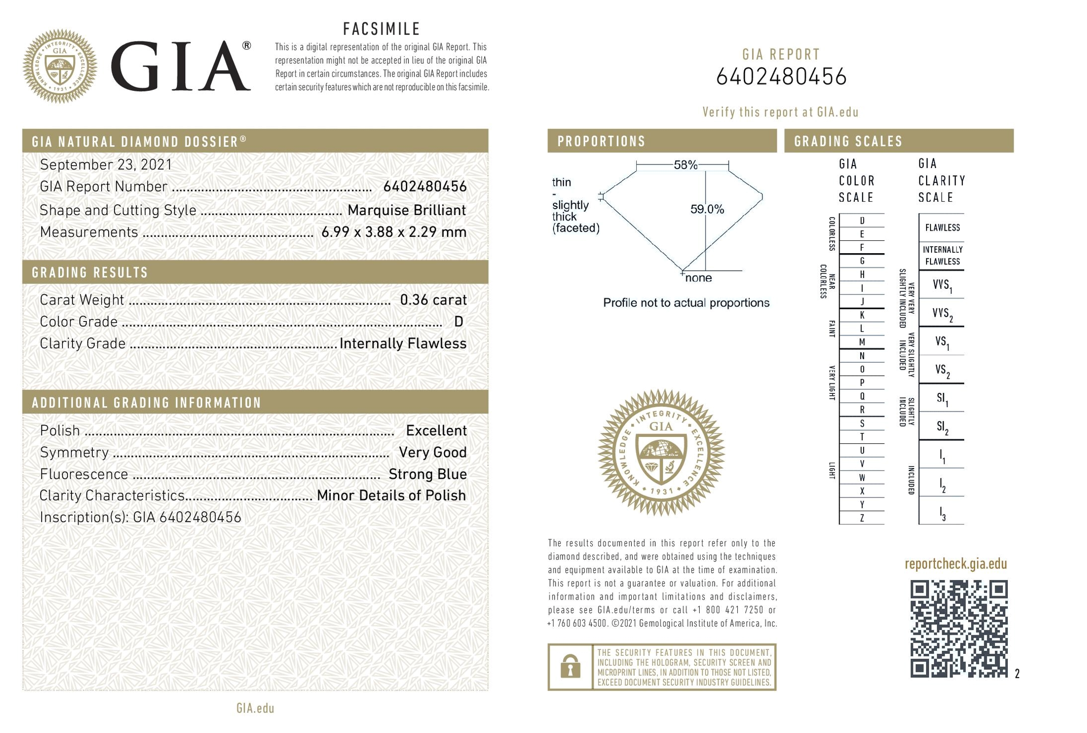 A loose marquise cut Diamond of 0.36ct (with GIA summary report graded as D IF #6402480456). (New)