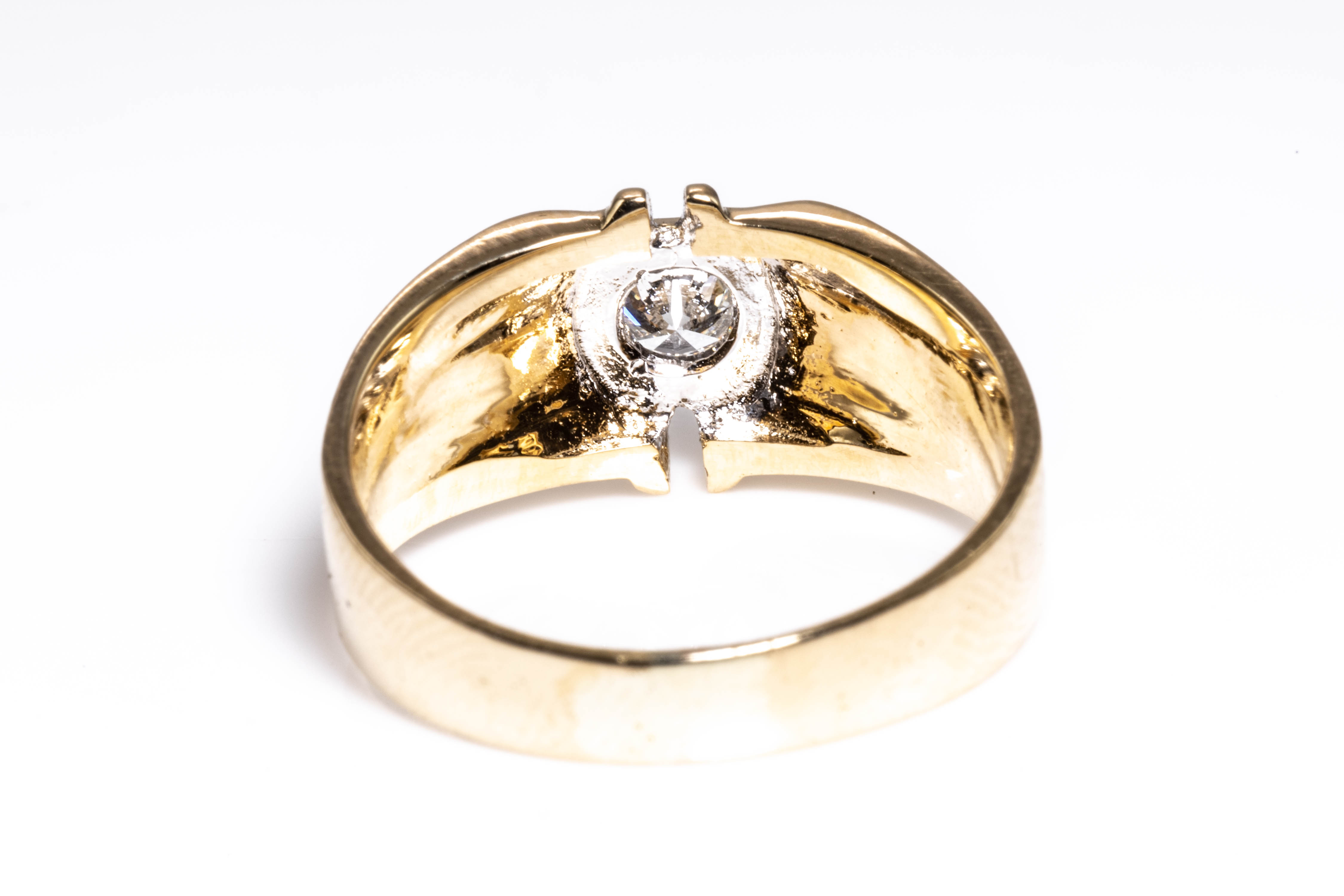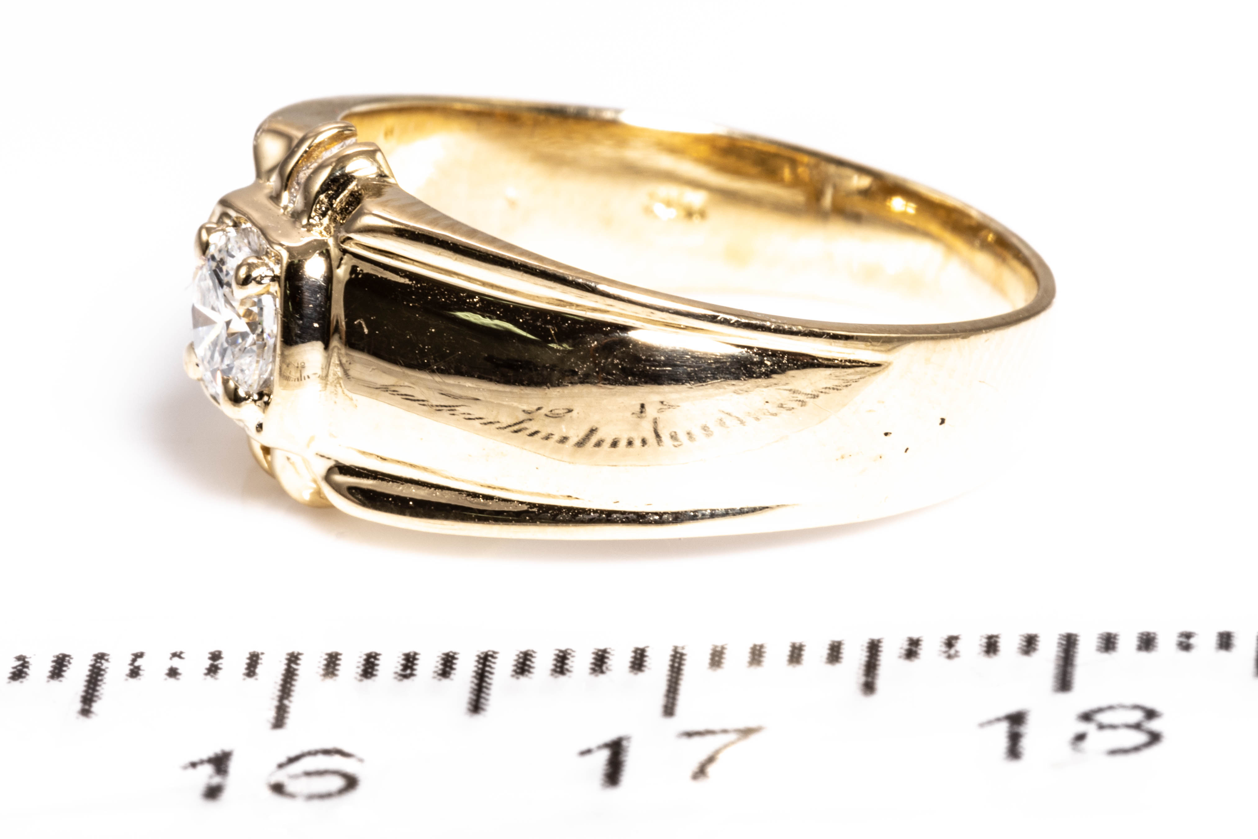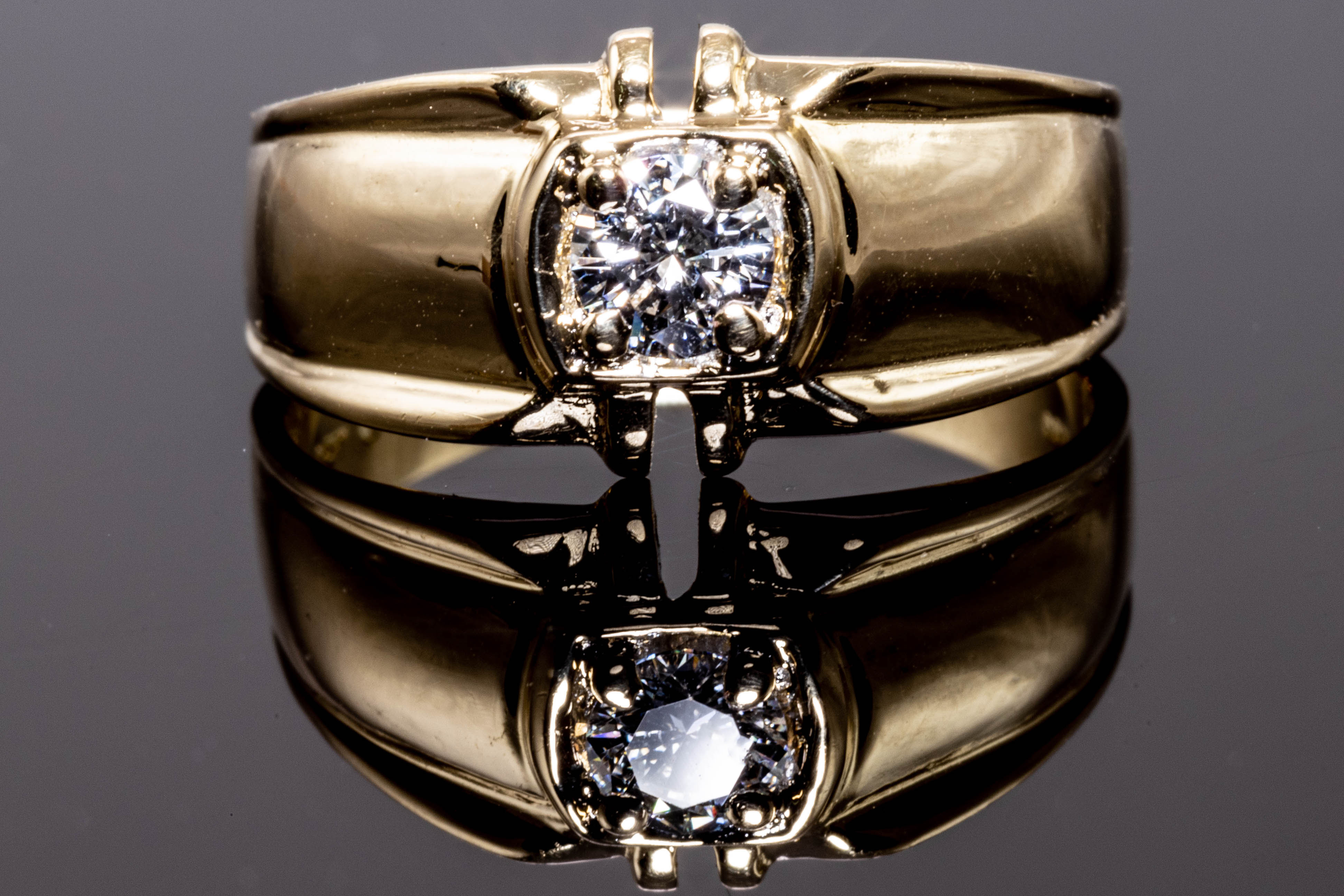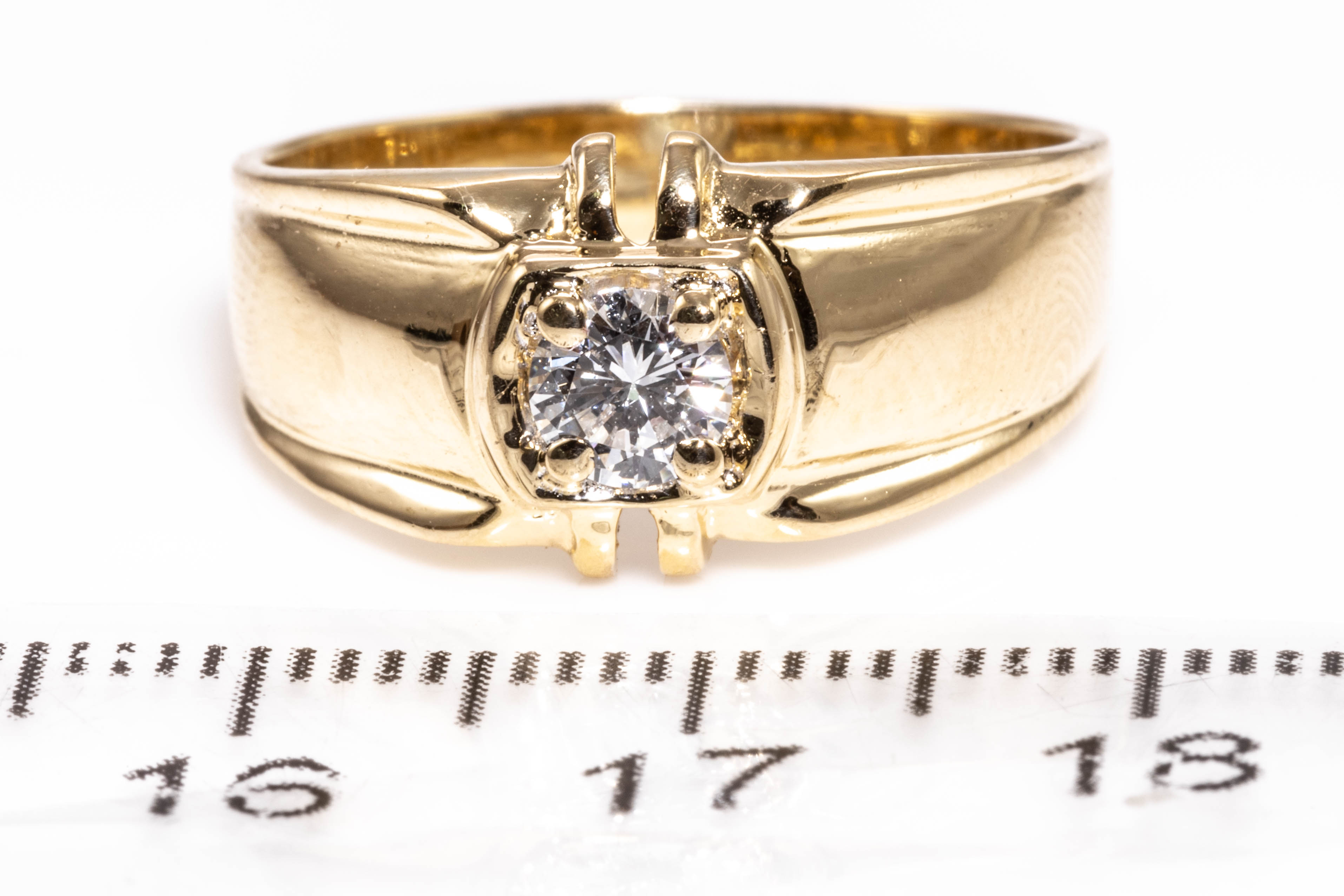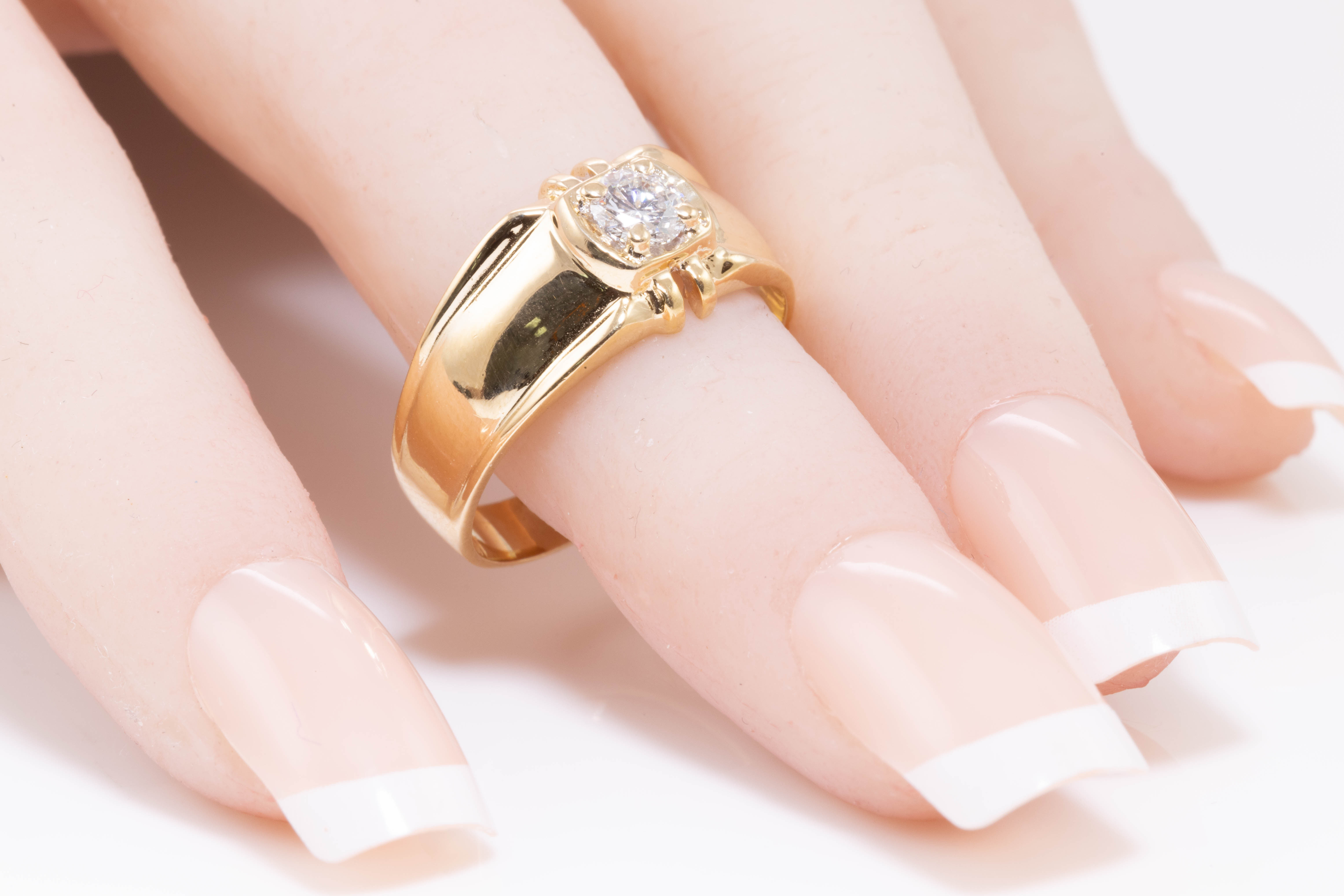 Diamond dress ring with round cut Diamond of approximately 0.36cts (Estimated grading G VS). 18ct yellow gold. Ring size Q. Weight 5.9g. (Pre-owned)