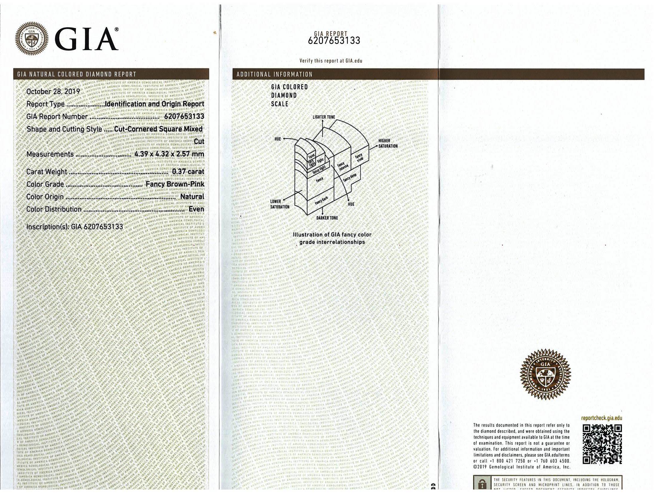 A loose radiant cut Diamond of 0.37ct (with GIA report graded as Natural Fancy Brown-Pink Even #6207653133). FSA estimated clarity grade: P1 (New)