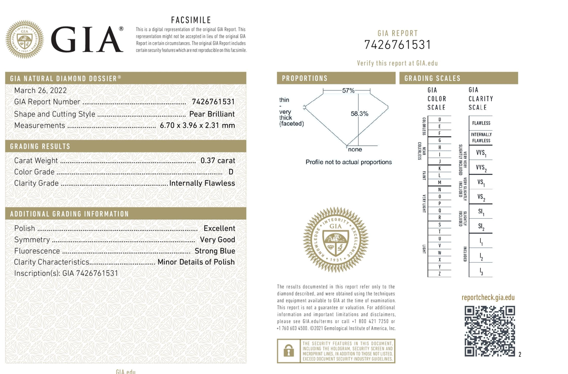 A loose pear shape Diamond of 0.37ct (with GIA summary report graded as D IF #7426761531). (New)