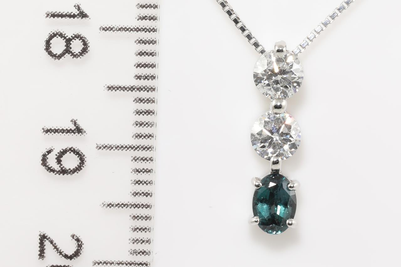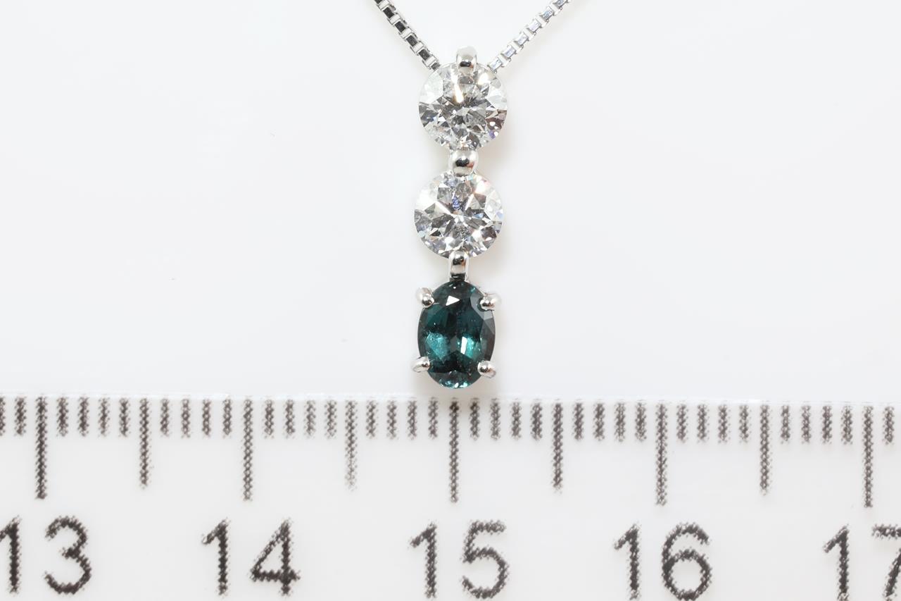 Alexandrite and Diamond pendant with oval Alexandrite of 0.38cts (colour change from blueish green to violetish blue) and Diamonds totalling 0.62cts (Estimated grading: H SI-P1). Platinum with 44cm adjustable chain. Weight: 4.3g (Pre-owned)
