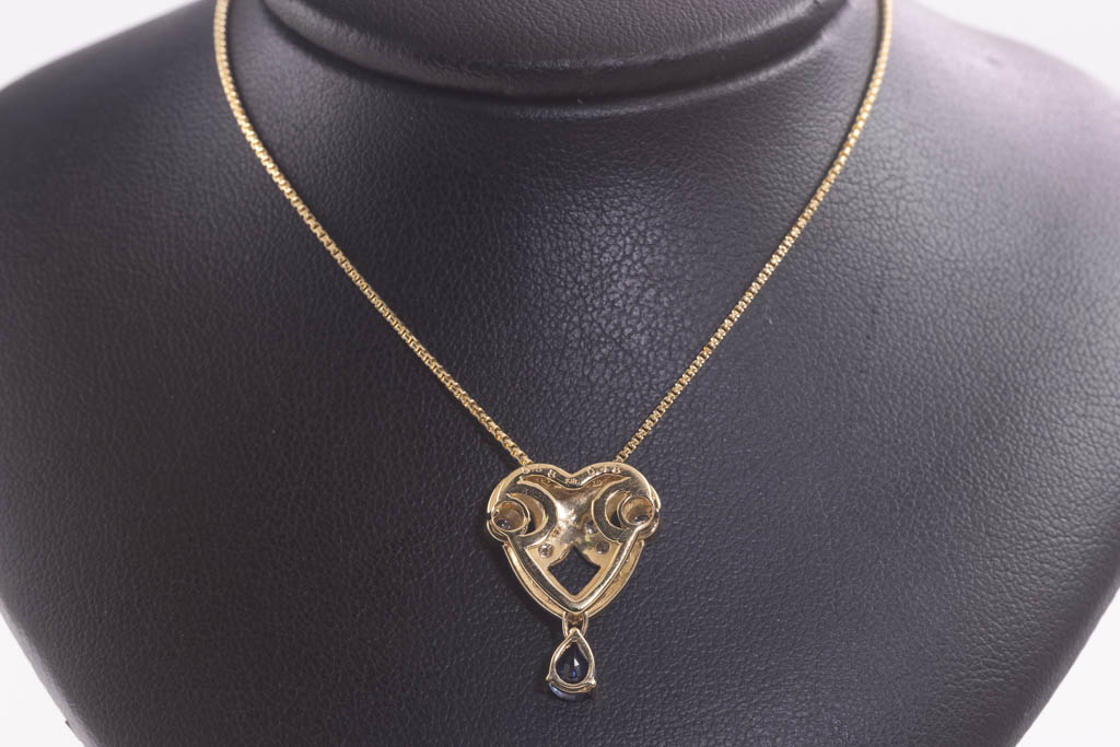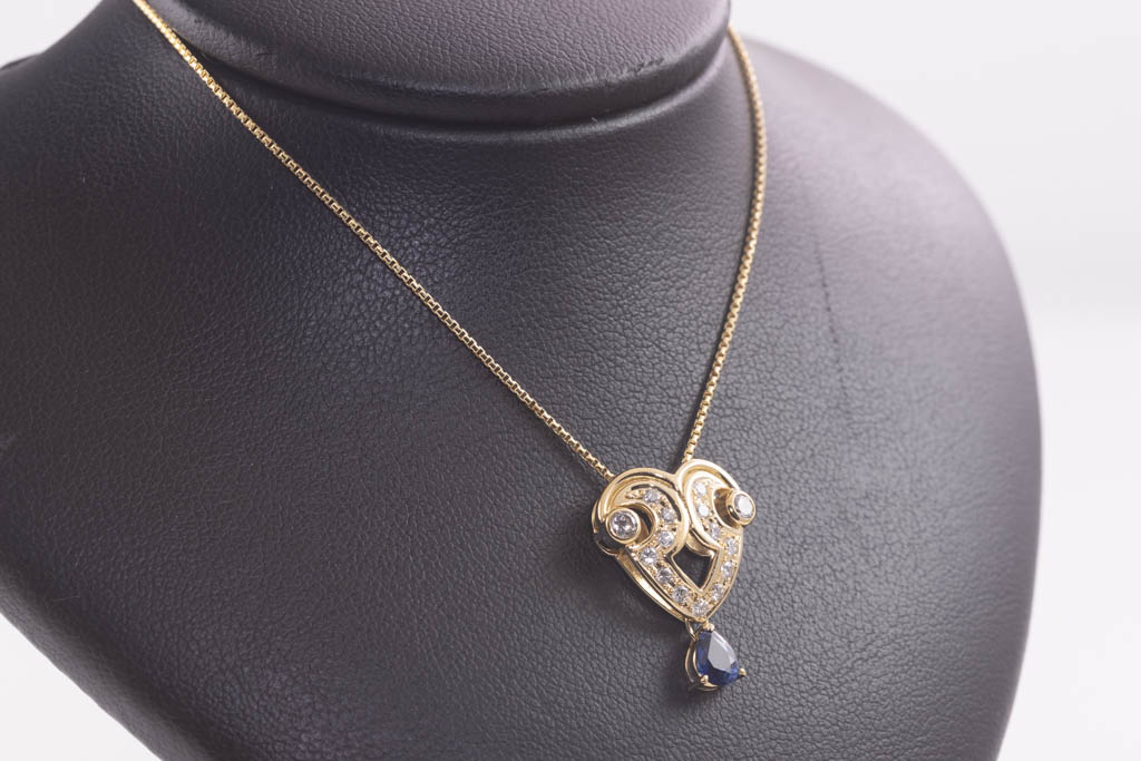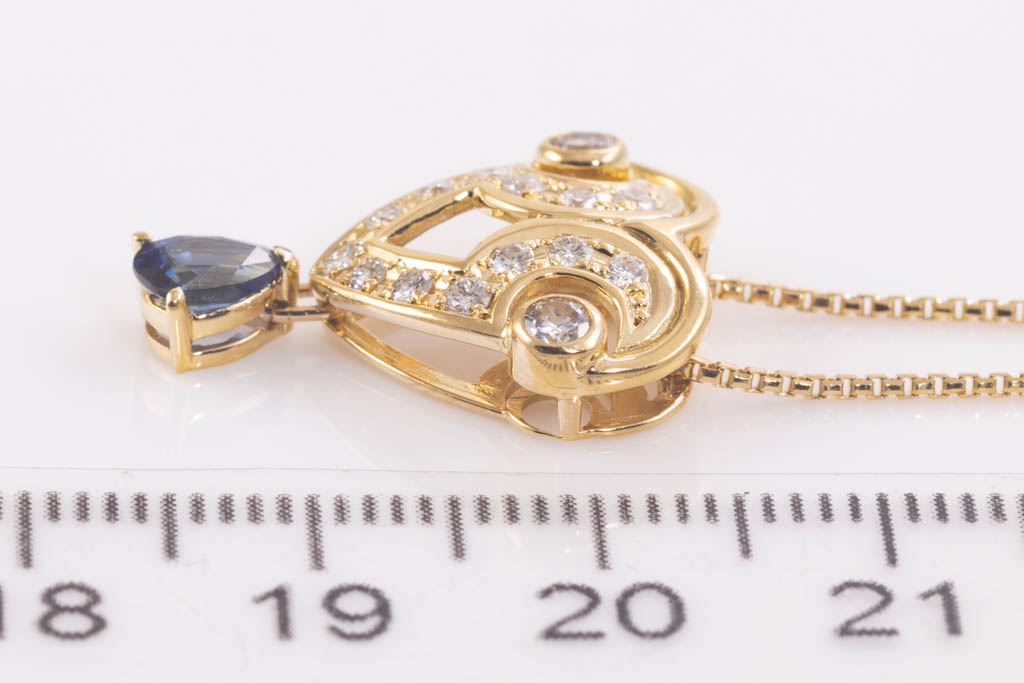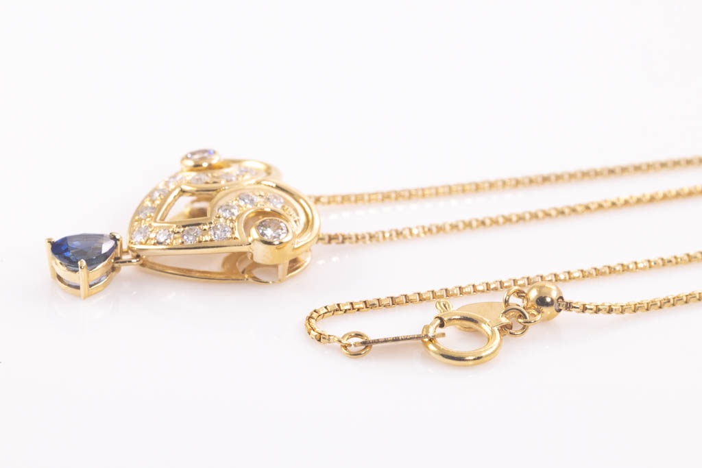 Sapphire and Diamond pendant with pear shape blue Sapphire of 0.38ct and round Diamonds totalling 0.48cts (Estimated grading: G-H SI). 18ct yellow gold with 45cm 18ct yellow gold adjustable chain. Weight: 5.7g. (Pre-owned)