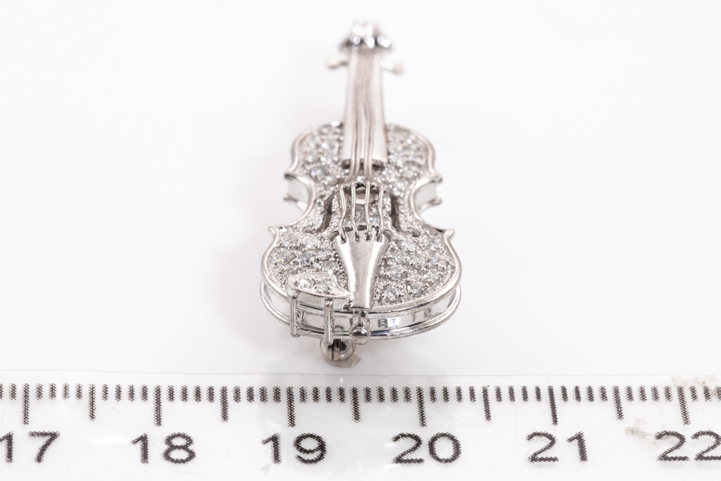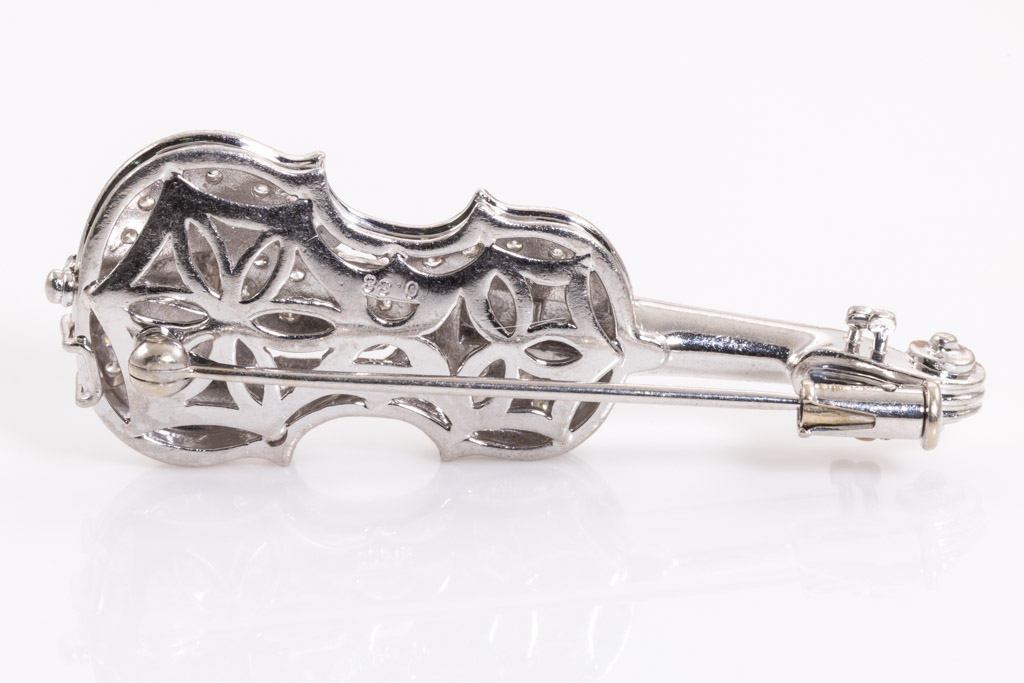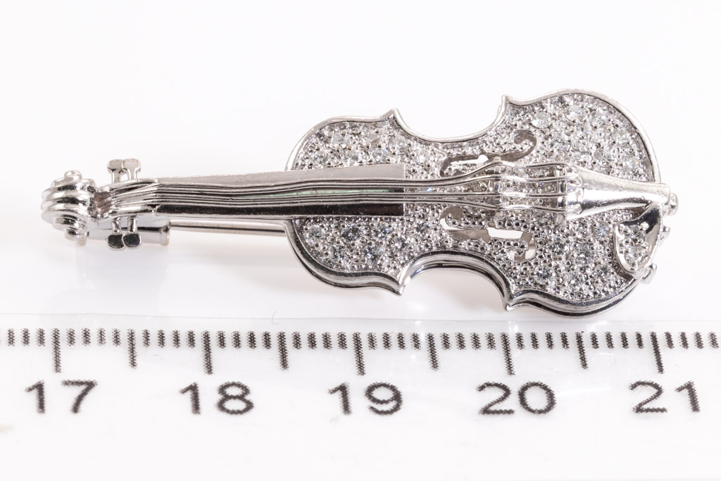 Diamond violin designed brooch with round Diamonds totalling 0.38cts (Estimated grading: G-H SI). 14ct white gold with platinum. Weight: 10.2g. (Pre-owned)