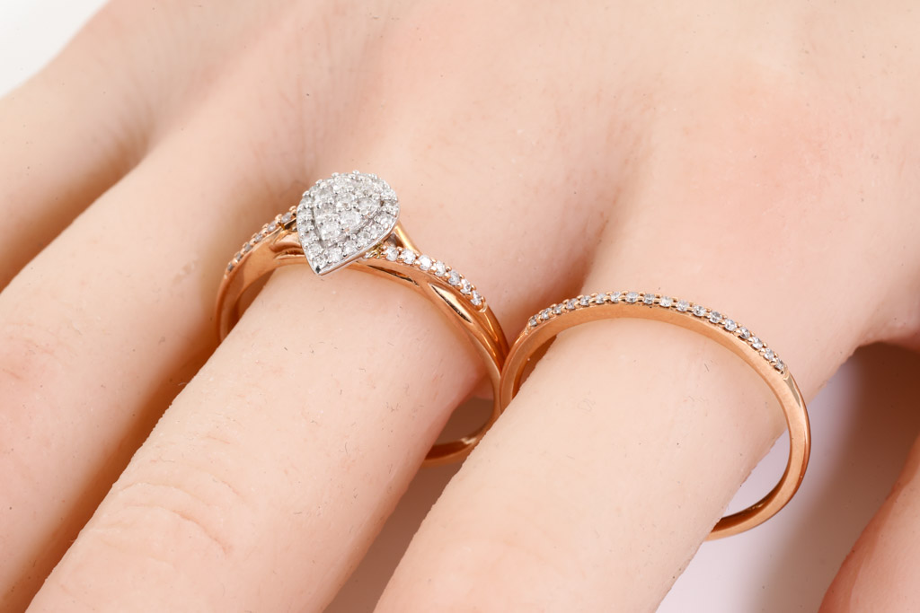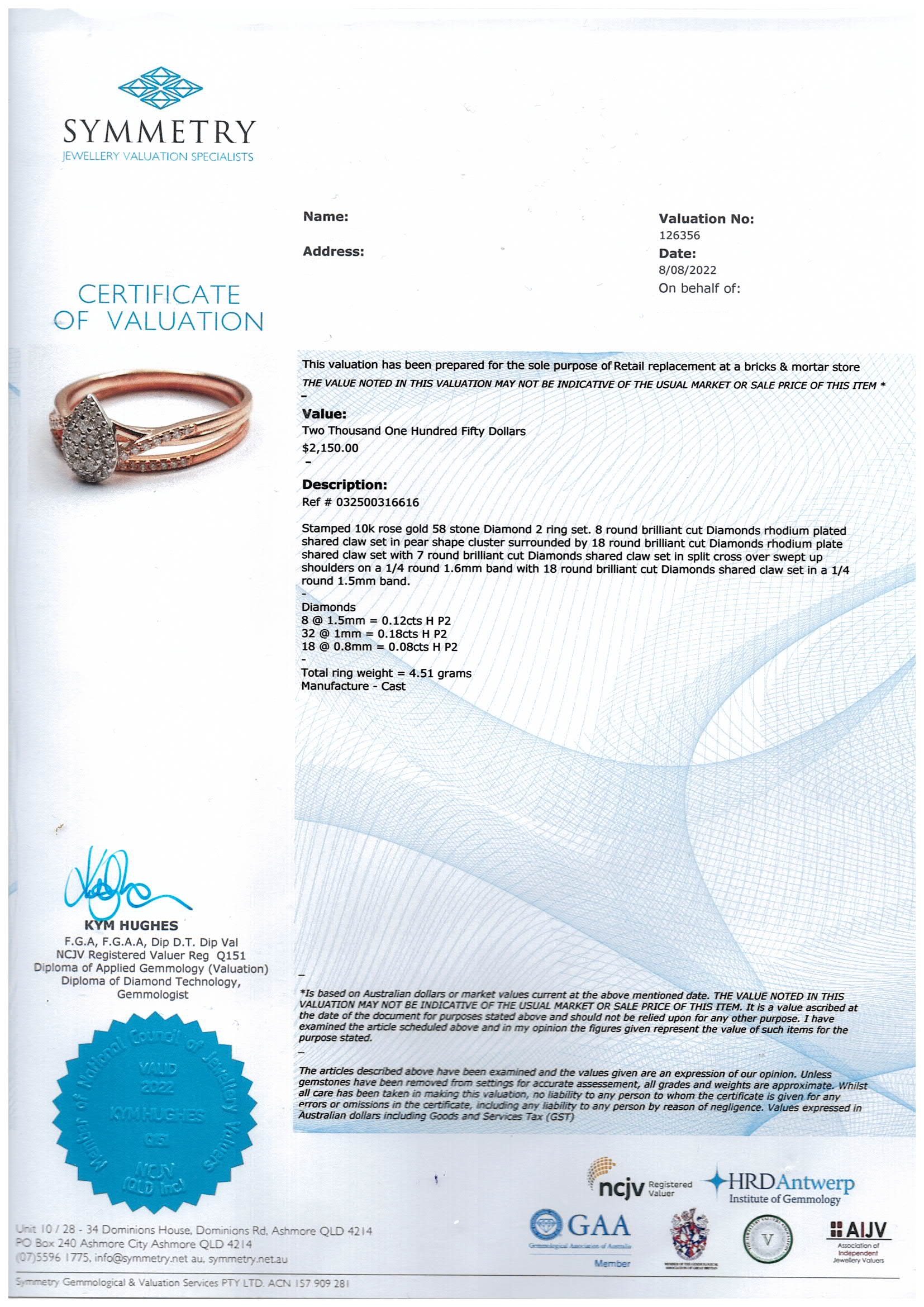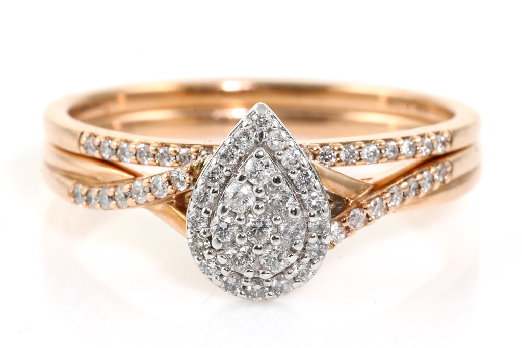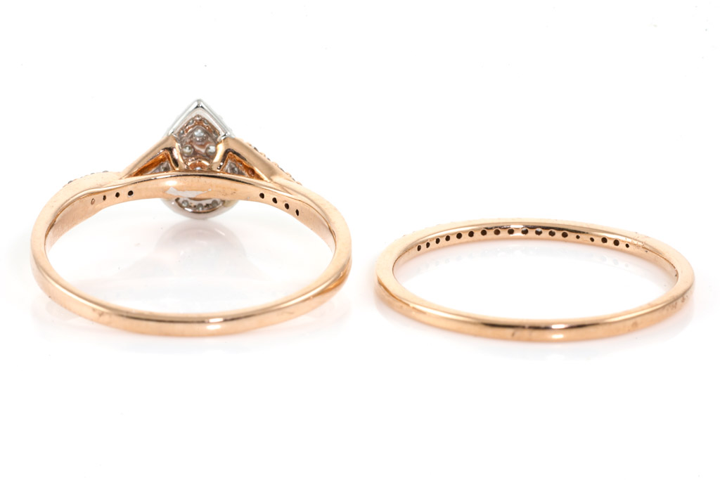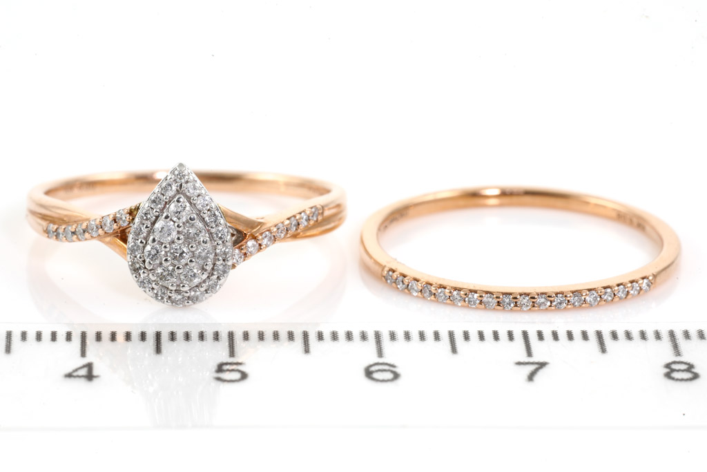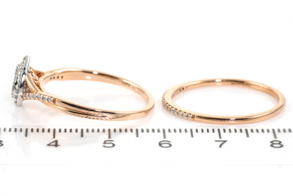 Diamond dress ring with matching Diamond eternity ring, both with round Diamonds totalling 0.38cts (Estimated grading H P2) 10ct rose gold. Ring size U - ring resizing is not recommended. Weight: 4.5g. With Valuation Certificate Ref# 032500316616. (Pre-owned)