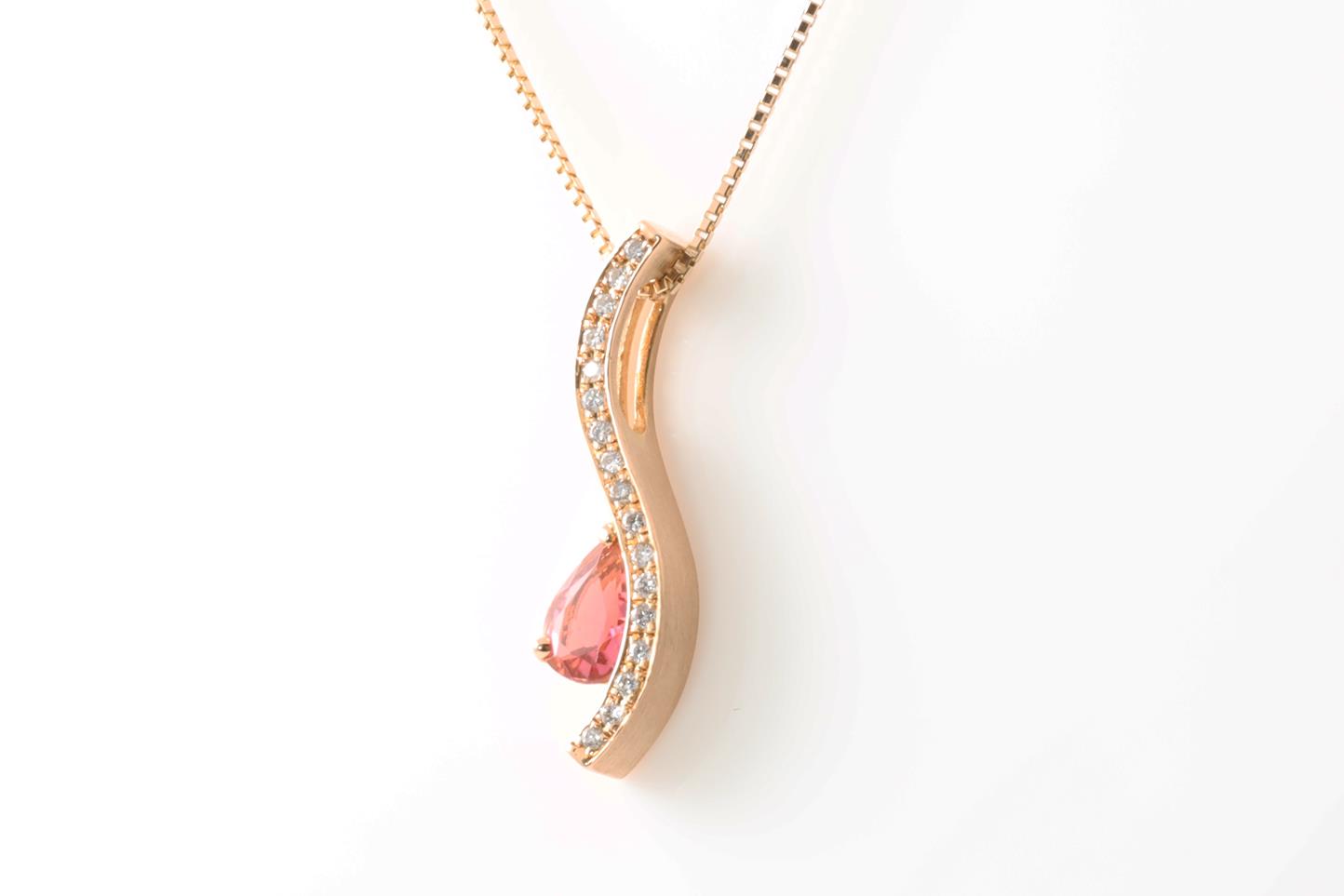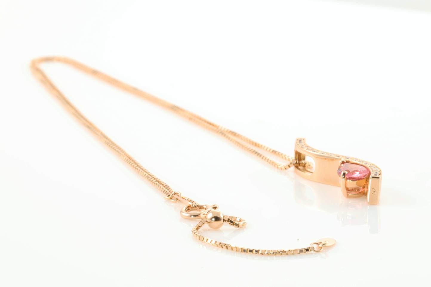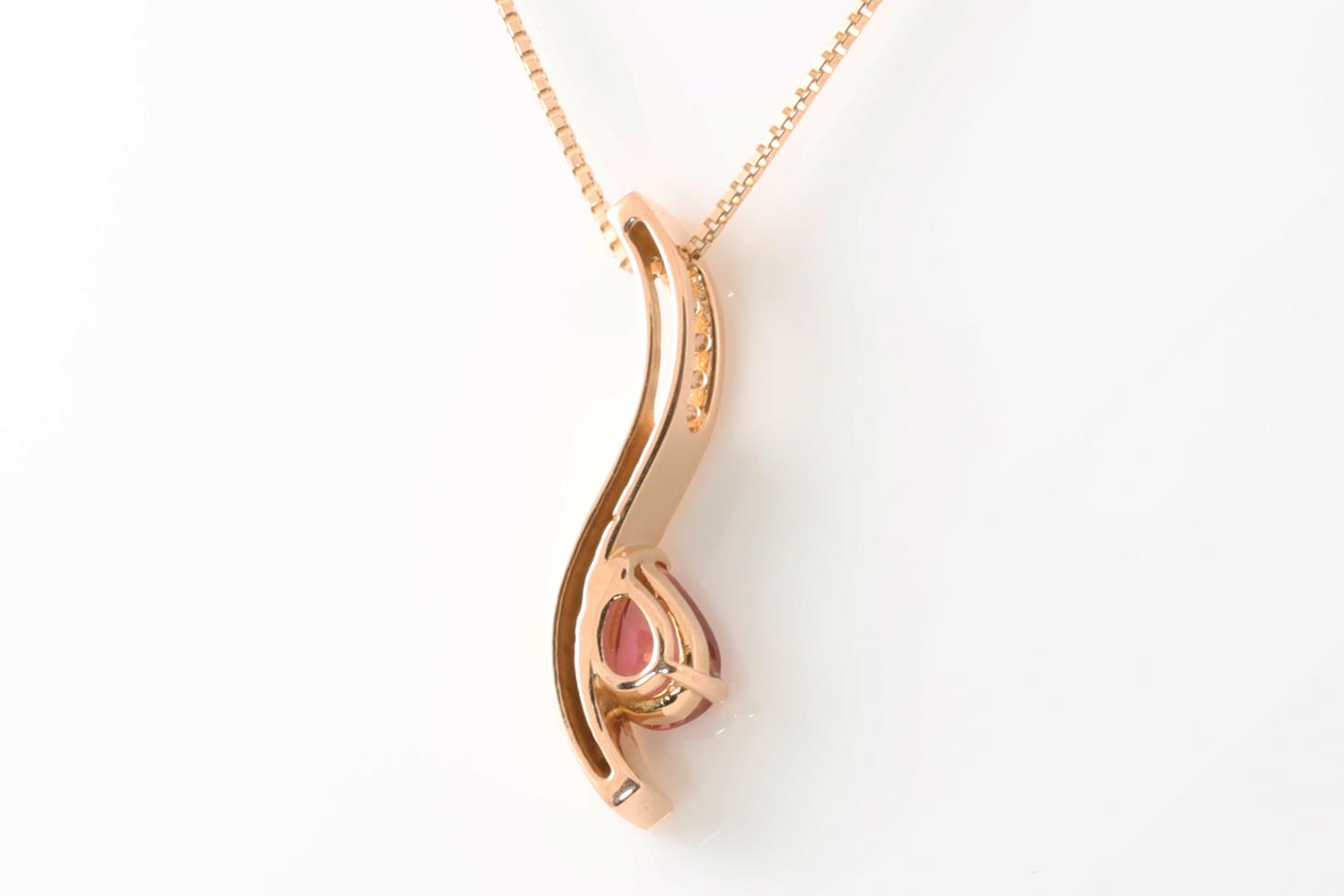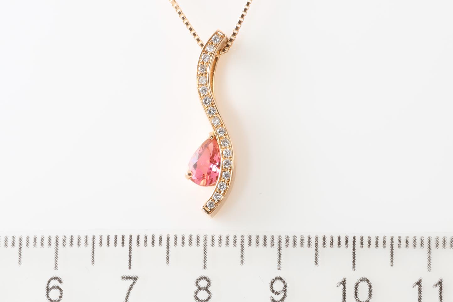 Tourmaline and Diamond pendant with pear shape Tourmaline of 0.38ct and Diamonds totalling 0.11cts. 18ct rose gold with 18ct gold 45cm adjustable chain. Weight: 4.6g (Pre-owned)
