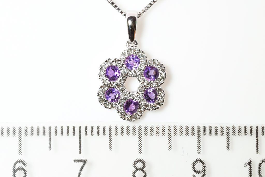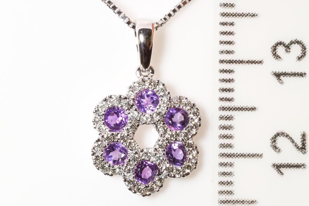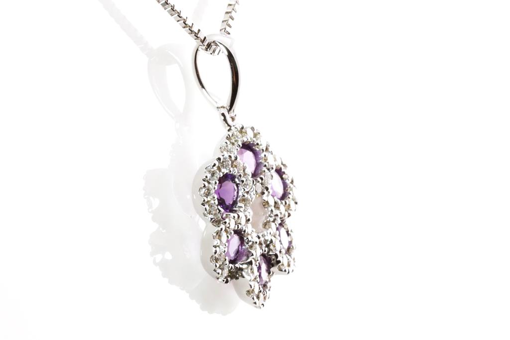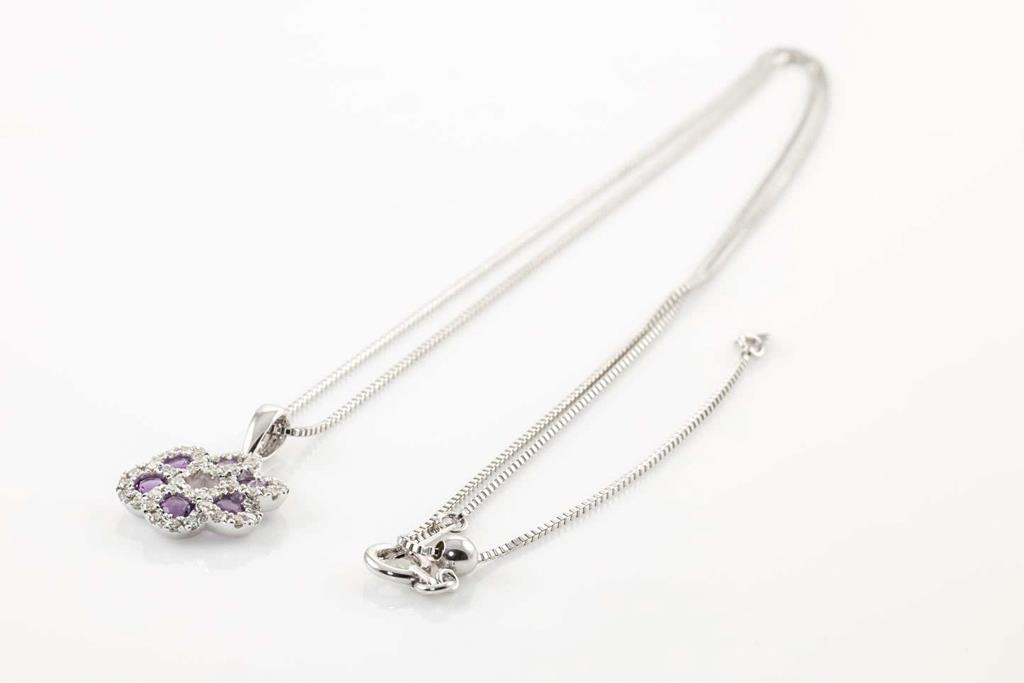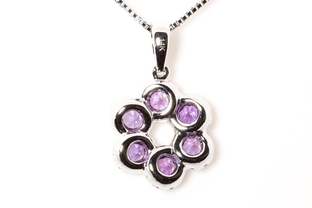 Amethyst and Diamond pendant with round shape Amethysts totalling 0.39ct and Diamonds totalling 0.22cts (Estimated grading: H SI). 14ct White gold with 18ct gold adjustable 45cm chain. Weight: 5.1g (New)
