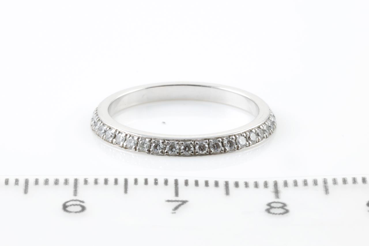 Diamond full hoop half knife edge eternity ring with round Diamonds totalling 0.39cts (Estimated grading: H SI). Platinum. Ring size J - ring resizing is not recommended. Weight: 2.8g. (Pre-owned)