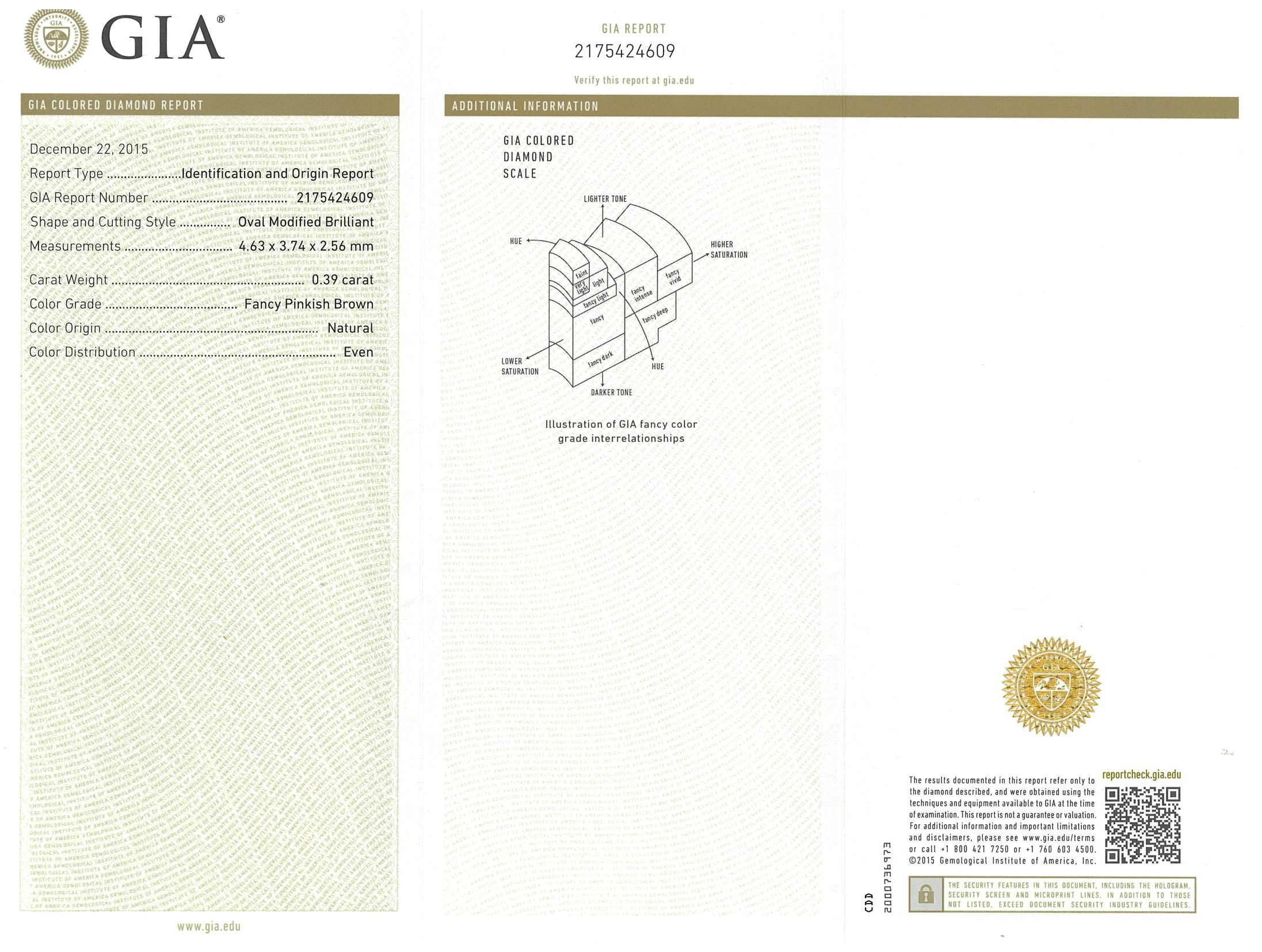 A loose oval shape Diamond of 0.39ct (with GIA report graded as Natural Fancy Pinkish Brown Even #2175424609). FSA estimated clarity grade: SI2 (New)