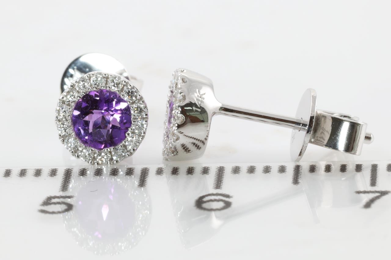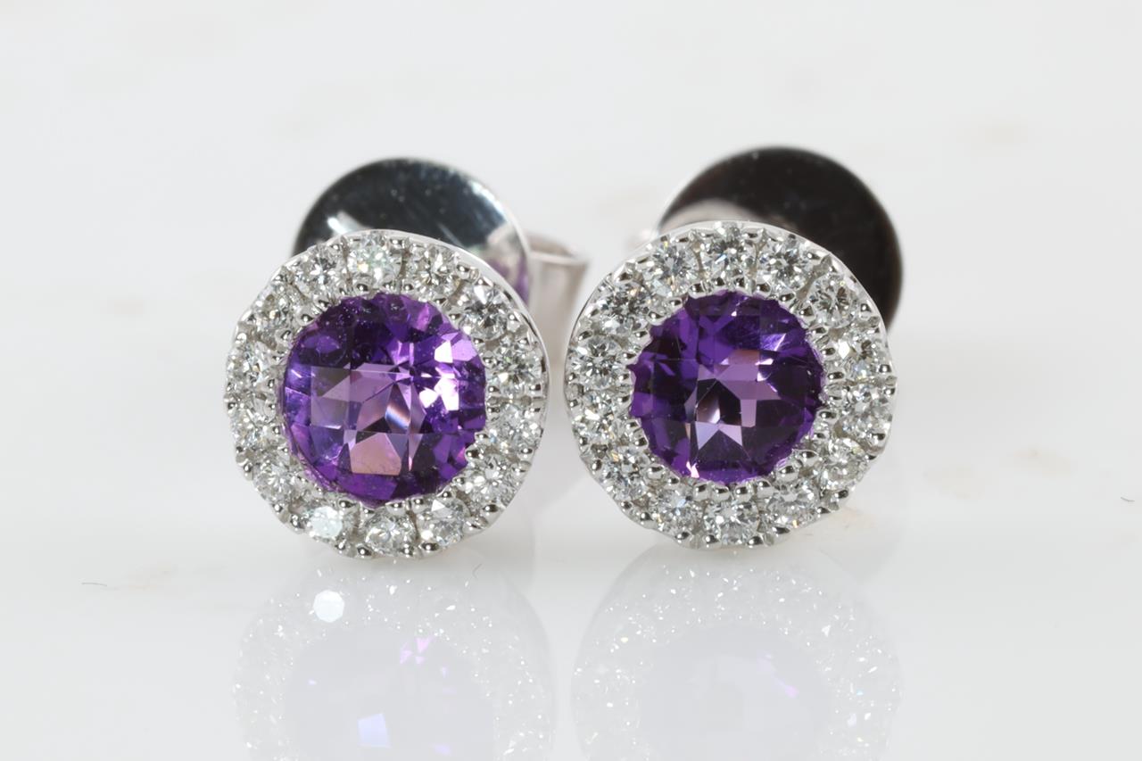 Amethyst and Diamond earrings with round checkerboard cut Amethysts totalling 0.40cts and Diamonds totalling 0.13cts. 14ct White gold. Weight: 1.5g (New)